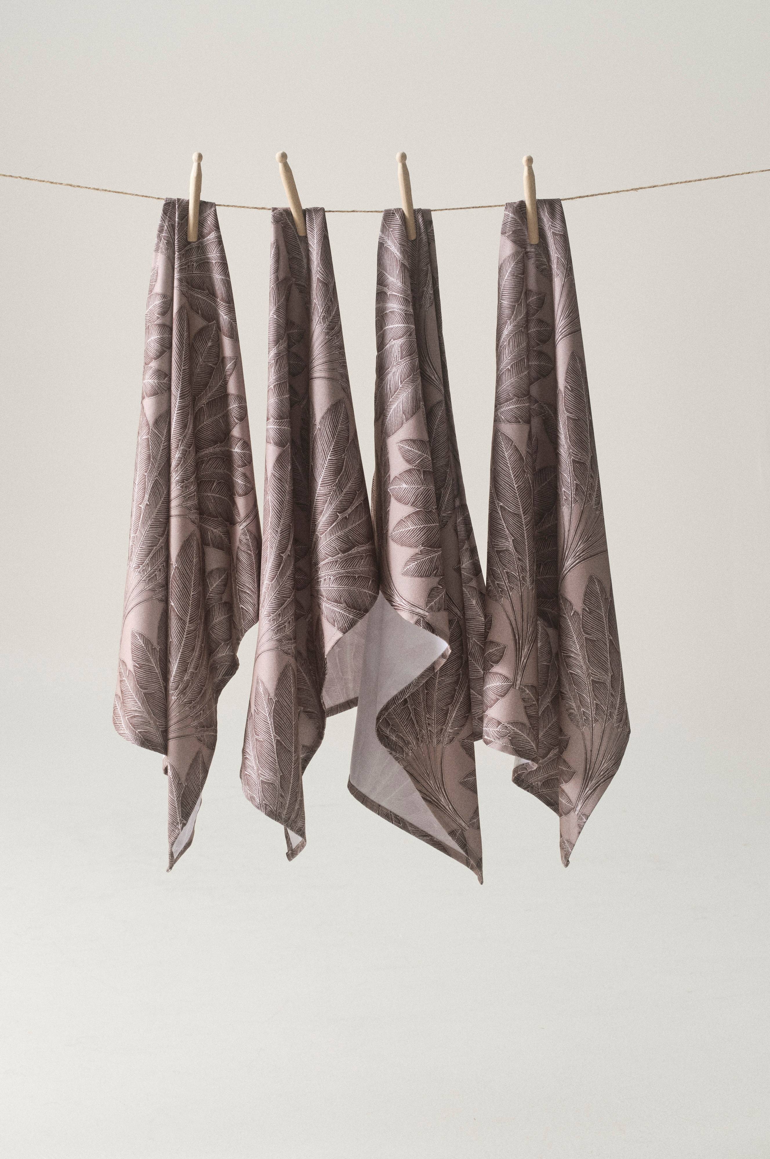 Een set van vier theedoeken van polyester met een schitterend geprint dessin van veren. De print heeft een donkerdere tint dan de ondergrond en straalt spanning en harmonie uit, met een vleugje retro.