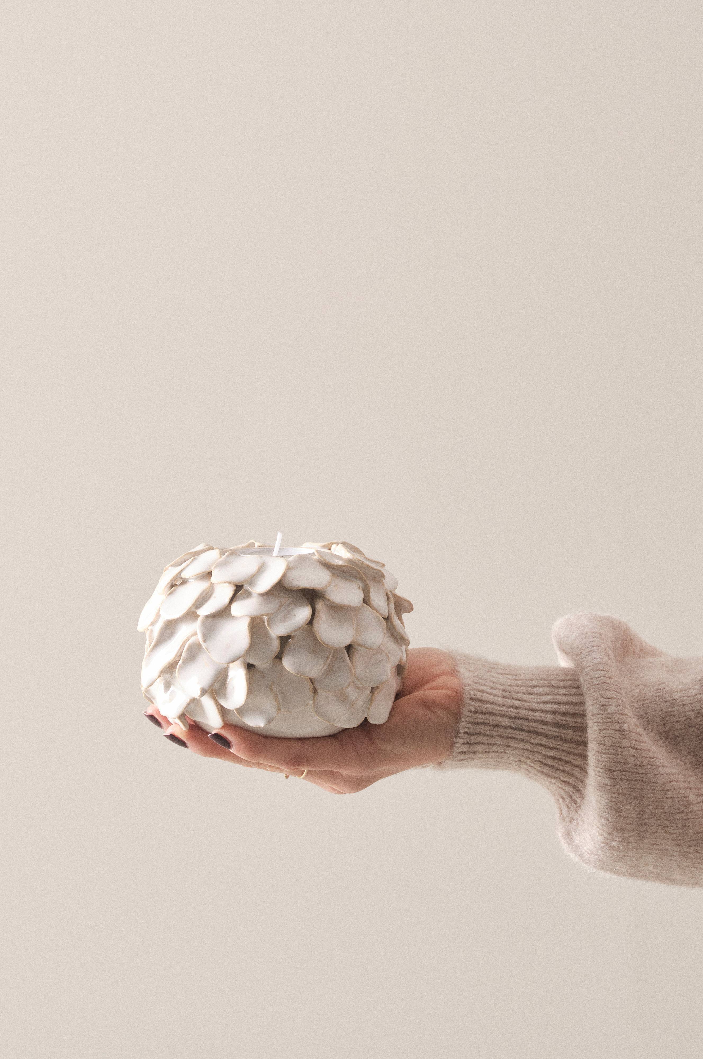 Een handgemaakte kaarshouder van keramiek met een glanzend glazuur met een licht gevlekt effect. De kaarshouder is voorzien van onregelmatige bloemblaadjes die allemaal met de hand zijn aangebracht: een echt precisiewerkje. Door het handwerk is elke kaarshouder uniek. Kaarsen zijn niet inbegrepen.