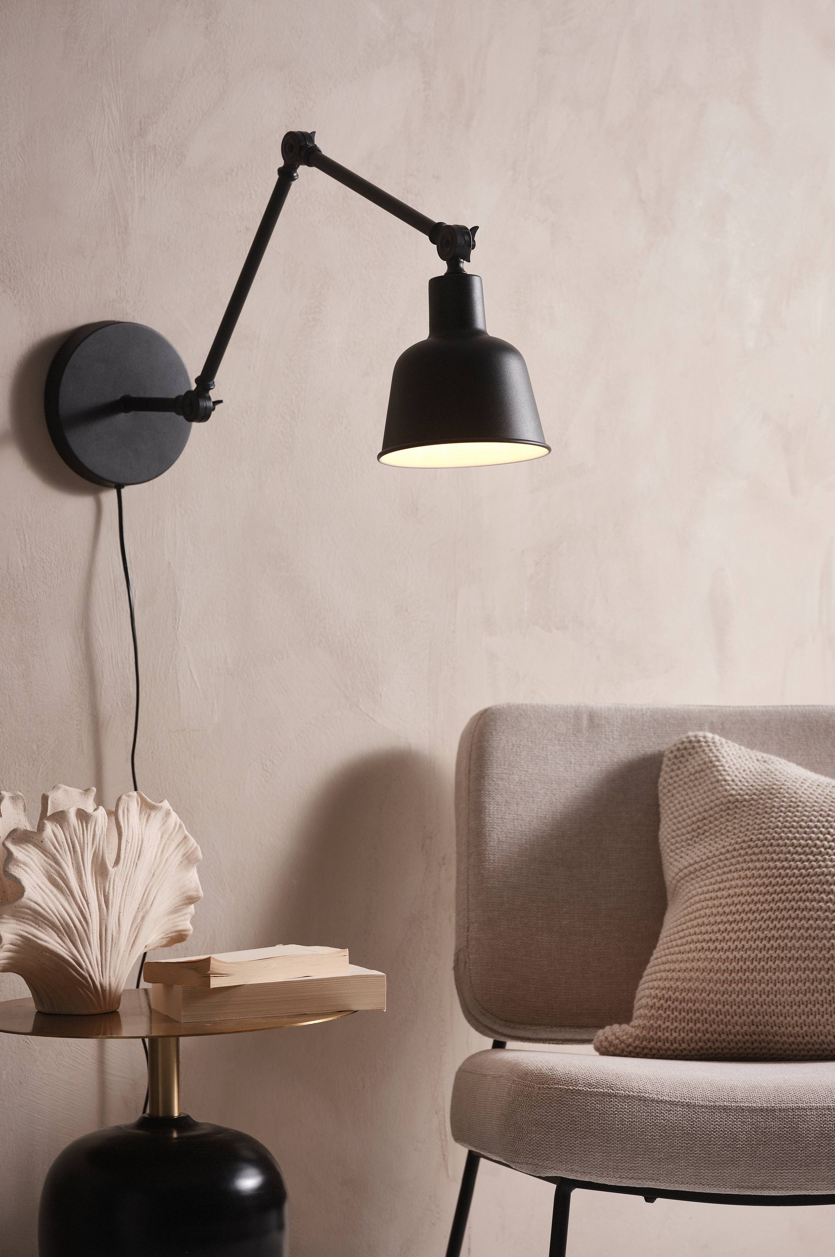 Een moderne wandlamp van metaal. Richt de lamp naar wens met de arm die op drie punten verstelbaar is. Snoerlengte 1,5 m.