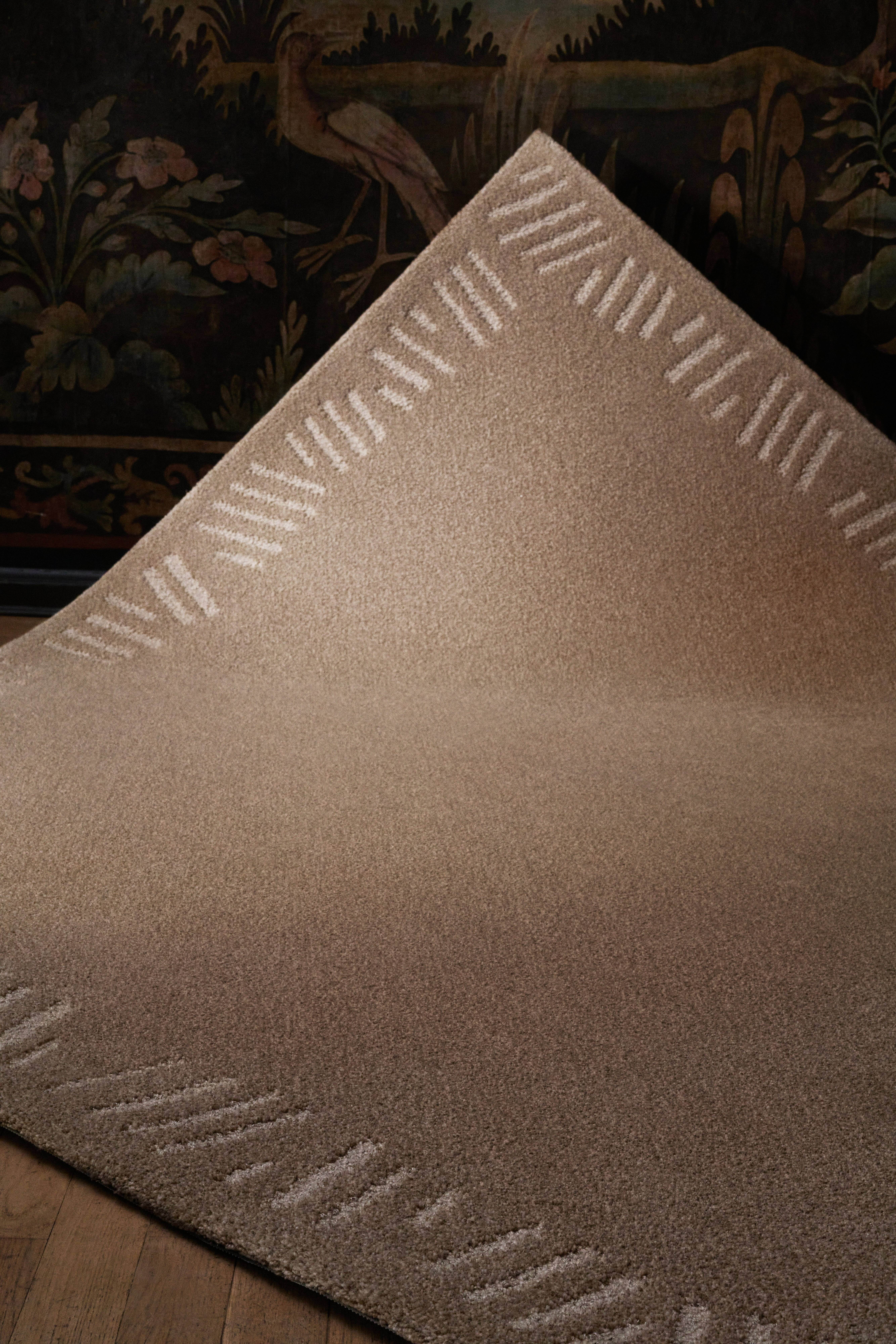 Het garen is een heerlijke mix van wol en linnen met een gemêleerd effect dat zorgt voor een natuurlijk, harmonieus gevoel. Het vloerkleed heeft een gesneden pool met een dessin van lusjes en een boord rondom. De wol is afkomstig uit Nieuw-Zeeland en het linnen komt uit Frankrijk. Wol en linnen zijn mooie natuurlijke materialen. Wol is heerlijk warm en van nature vuilafstotend.