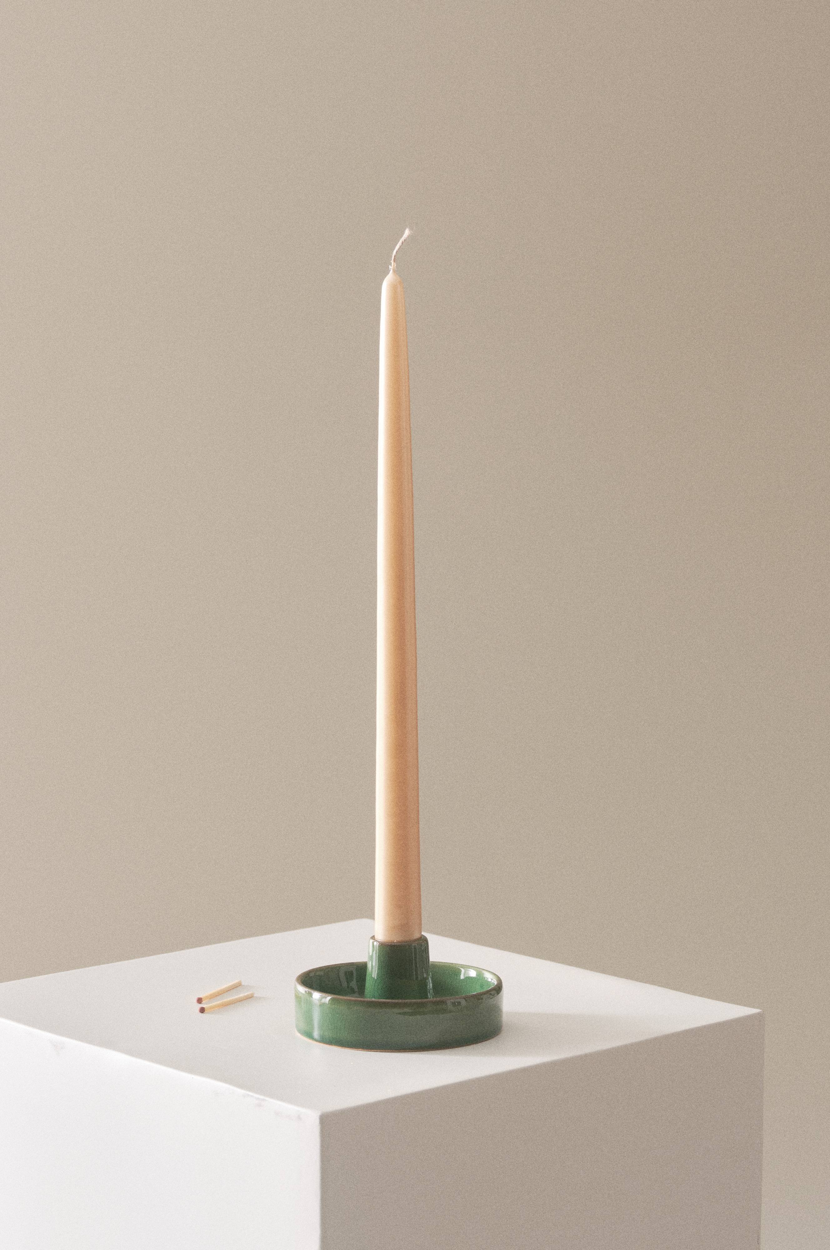 Een handgemaakte kandelaar van keramiek. De kandelaar heeft een stijlvolle, klassieke vorm en is in een mooie kleurnuance geglazuurd. De kandelaar past perfect in een ouderwets, rustiek interieur en sluit ook aan bij een moderne, ingetogen stijl. De praktische rand rondom de voet vangt eventueel druipend kaarsvet op, zodat je tafelkleed of tafelblad vlekvrij blijft. Door het mooie handwerk is elke kandelaar uniek.