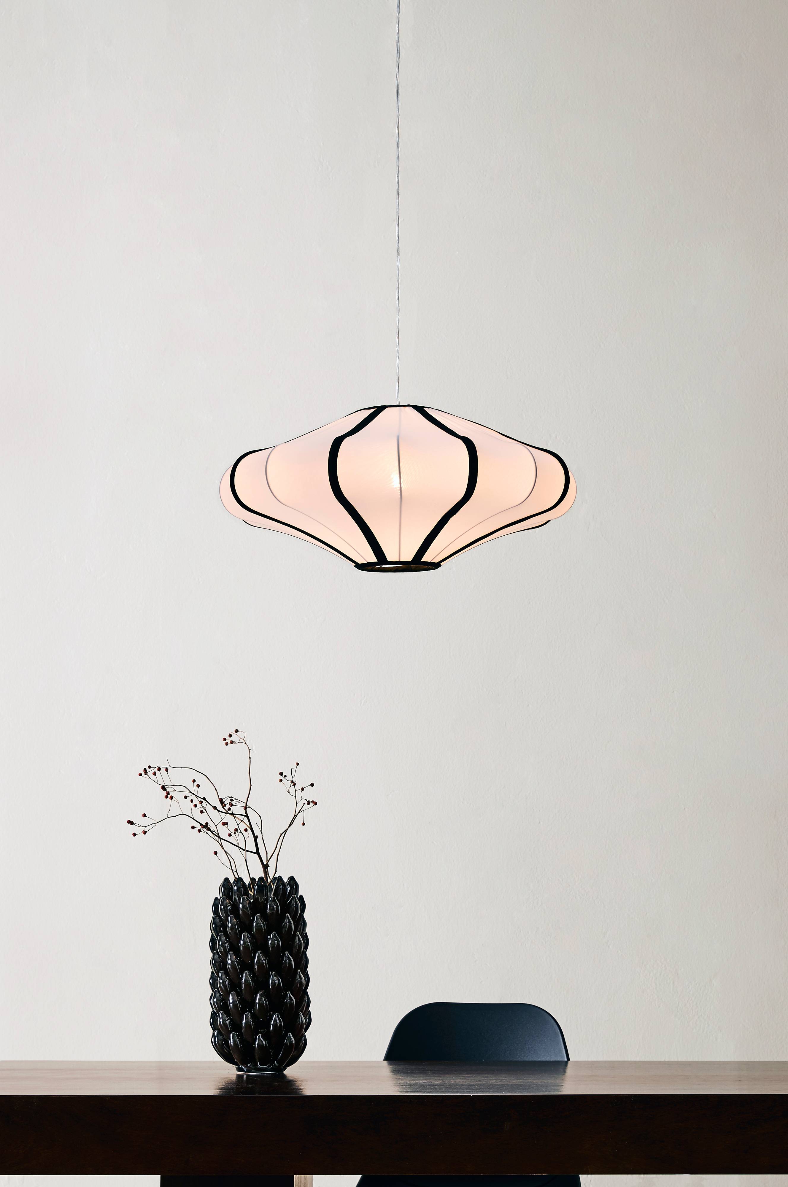 Hanglamp van witte stretchstof met zwart fluweelband en een metalen frame. MARGAUX heeft de uitstraling van een wolk en een duidelijke retrostijl. De plafondcup is zilverkleurig. Transparant snoer. De lamp is geaard, klasse 1. Op grond van EU-regelgeving is er in sommige landen een losse plafondstekker nodig. De plafondstekker moet geaard zijn (klasse 1) en wordt los verkocht.