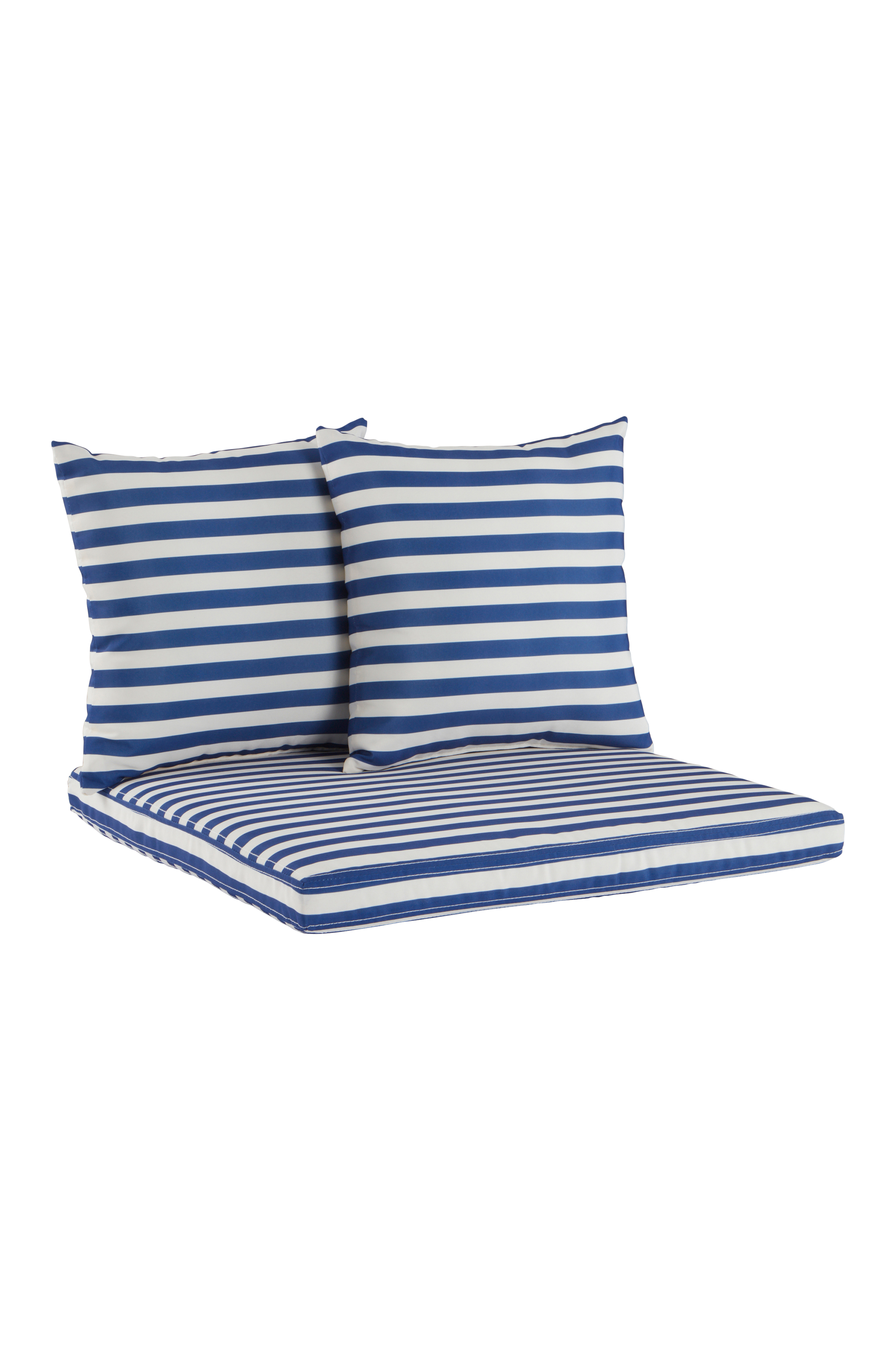 Een gestreepte kussenset voor tuinmeubels. De set bestaat uit een zitkussen en twee kussens. De set heeft een bekleding van polyester met een geprint bloemendessin en een waterafstotende coating. Zowel het zitkussen als de kussens hebben een binnenkussen met schuimvulling. De bekleding is afneembaar en heeft een ritssluiting. De stof heeft een slijtvastheid van 30.000 Martindale.
