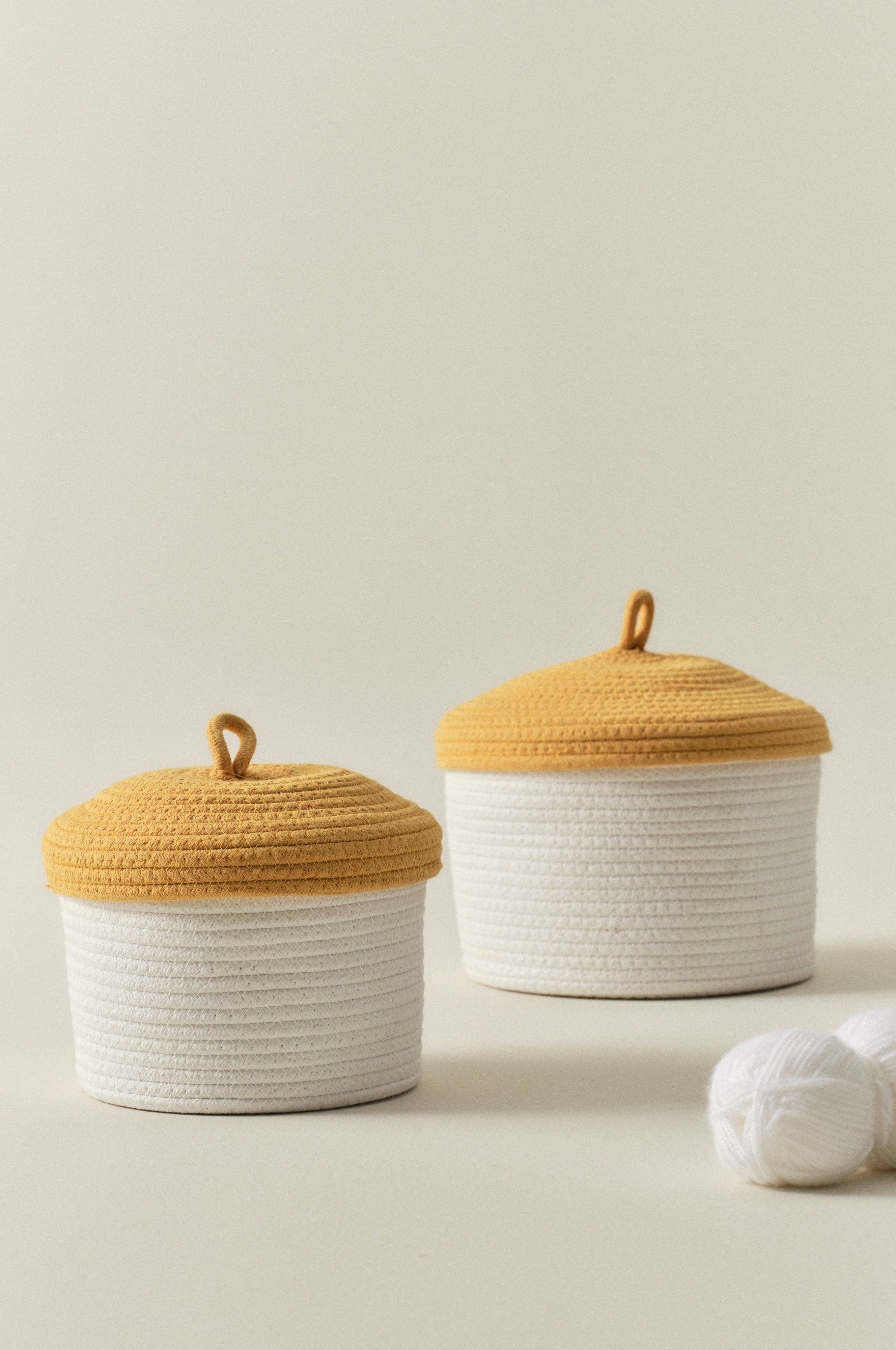 2-pack katoenen touwmanden, handgemaakt met deksels. Organiseer moeiteloos en voeg handgemaakte charme toe aan je gezellige huis. Perfect om kleine dingen in op te bergen.