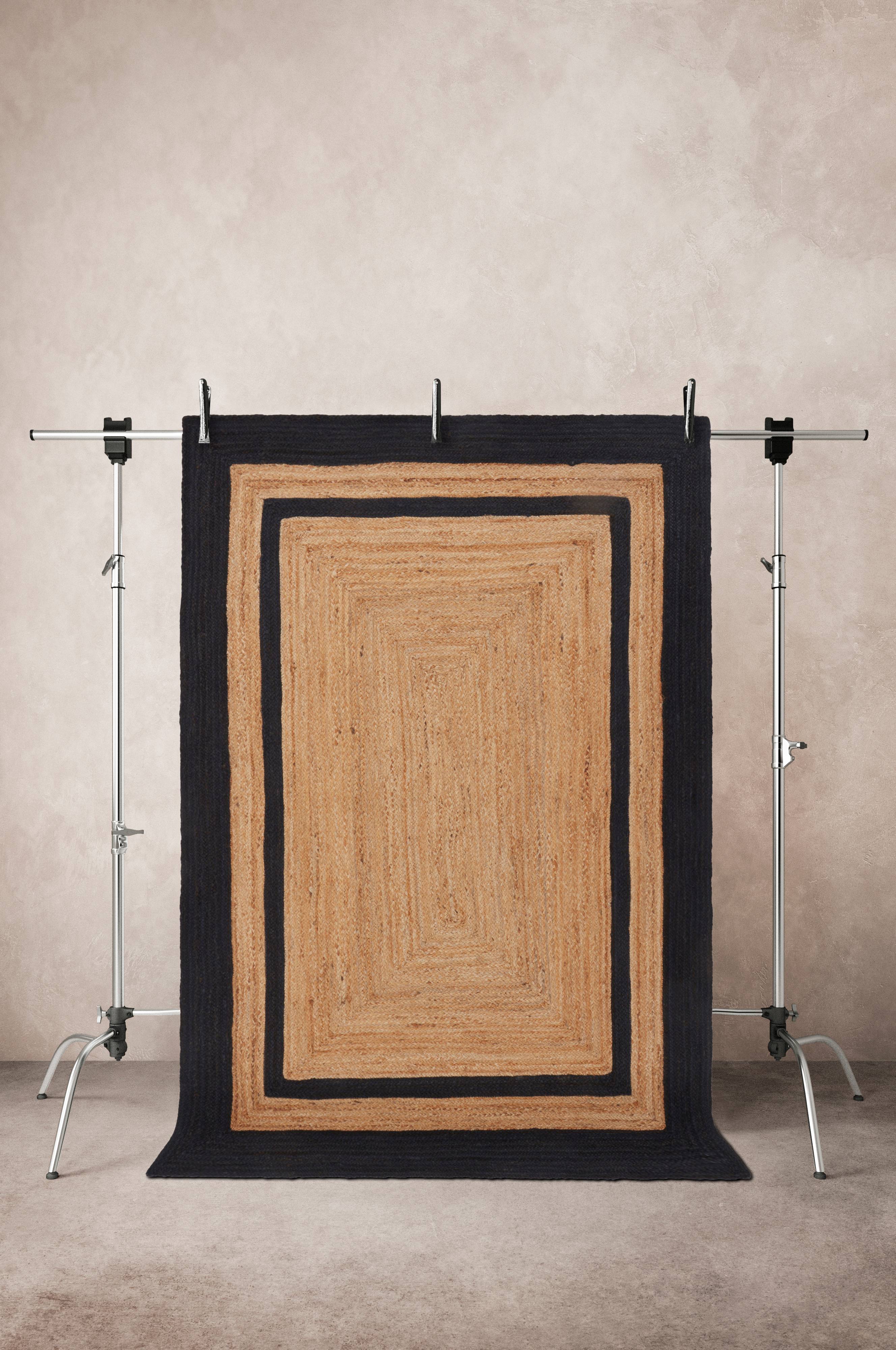 Een met de hand geweven vloerkleed van jute. Het vloerkleed is natuurlijk gemêleerd en is tweekleurig met kaders rondom. Jute is een rustiek natuurlijk materiaal. Past perfect onder de zithoek of de eettafel op het terras en verbindt de buitenruimte met de natuur. Een handgemaakt vloekleed is een prachtig stuk handwerk waardoor elk vloerkleed uniek is. Dikte 0,7 cm. 2100 gr./m².