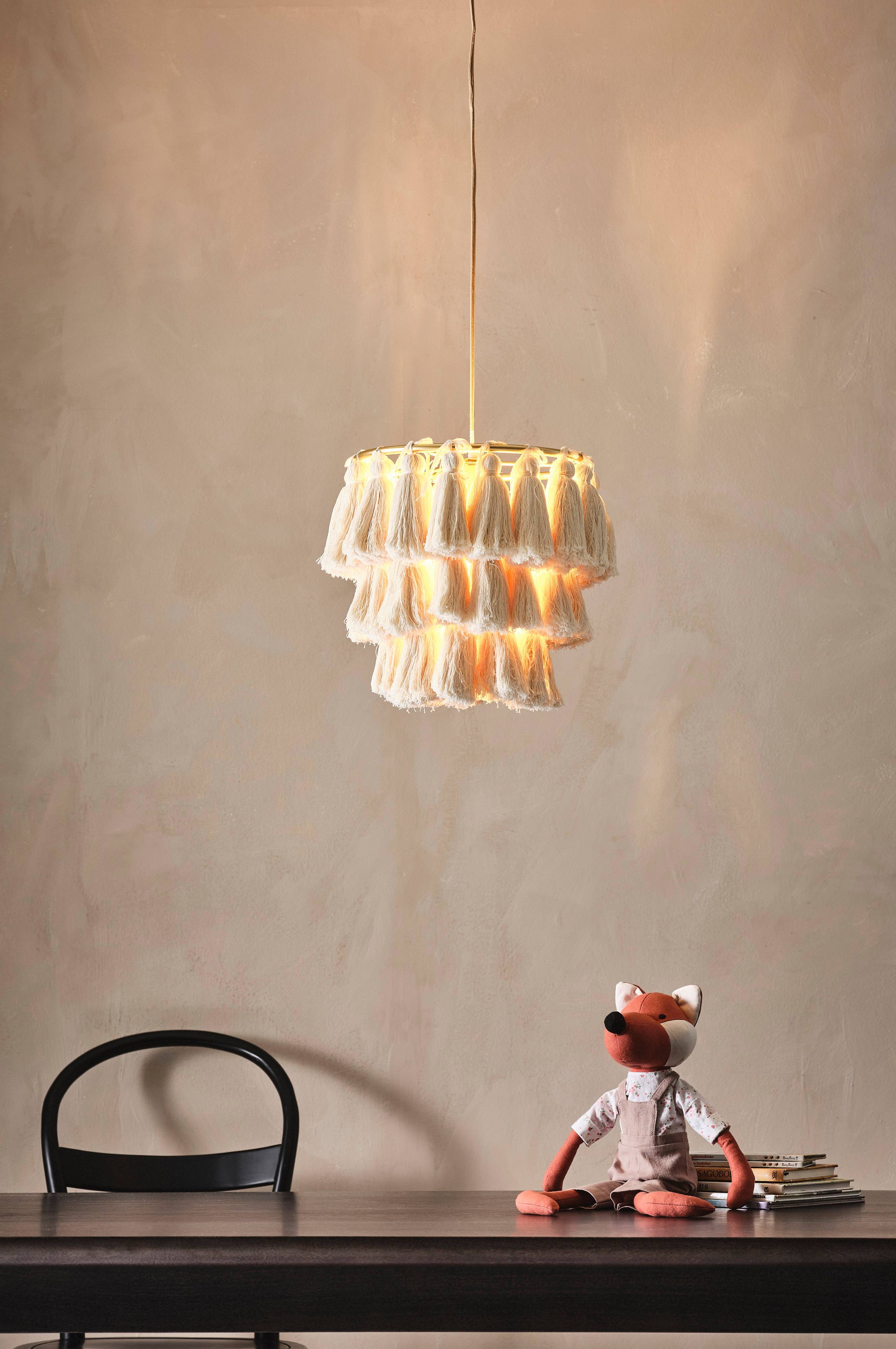 Een hanglamp van goudkleurig metaal en grote decoratieve kwasten van katoenen garen. MILLAU is een unieke lamp die opvalt en de gezelligheidsfactor in iedere ruimte verhoogt. Textielsnoer, lengte 0,85 m. Exclusief plafondstekker op grond van nieuwe EU-regelgeving. Een plafondstekker is los verkrijgbaar en heet ROOF MOON plafondstekker.