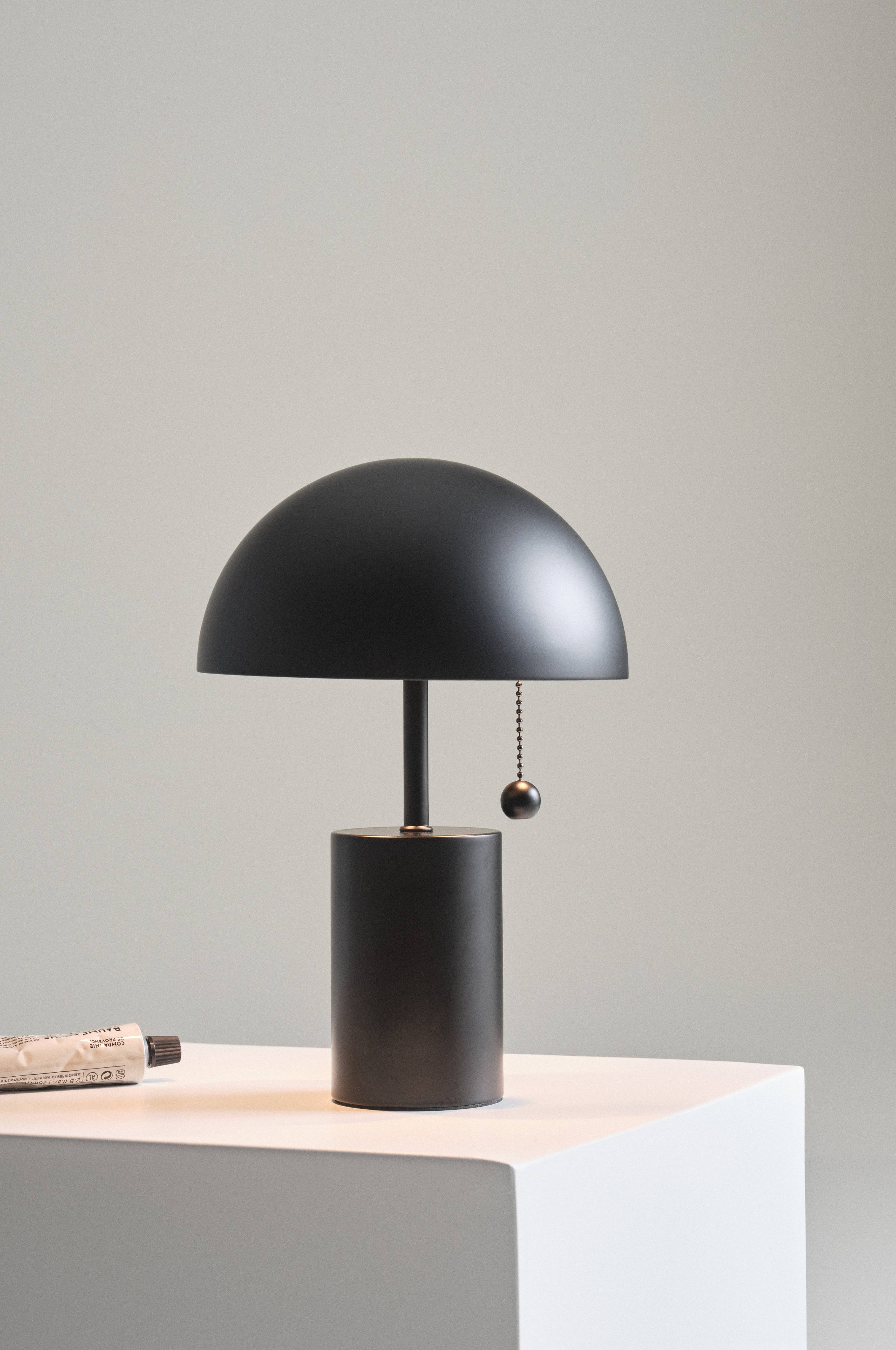 Een mooie tafellamp van metaal met een ronde kap, een homogene lamp die fijn licht geeft. De lamp heeft een trekschakelaar onder de kap, trek aan het bolletje van de ketting om de lamp in en uit te schakelen, praktisch en decoratief. Ook het snoer is in dezelfde kleur.
