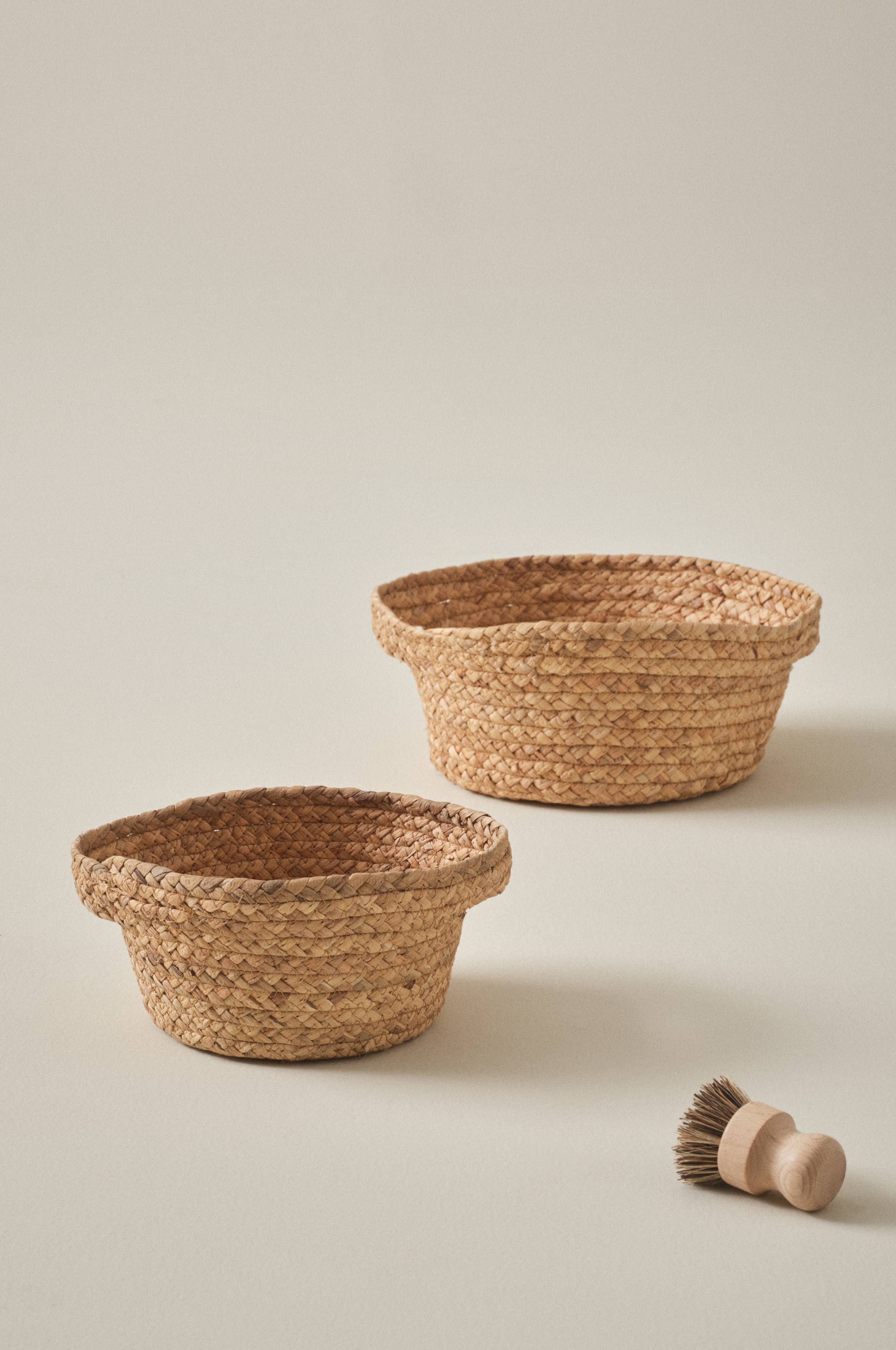Een set van twee manden van met de hand gevlochten waterhyacint. De ronde manden hebben een randje bovenaan en twee openingen als handgrepen. De manden zijn even goed geschikt voor brood en fruit als speelgoed. Het mooie handwerk in combinatie met het natuurlijke materiaal maakt elke mand uniek.