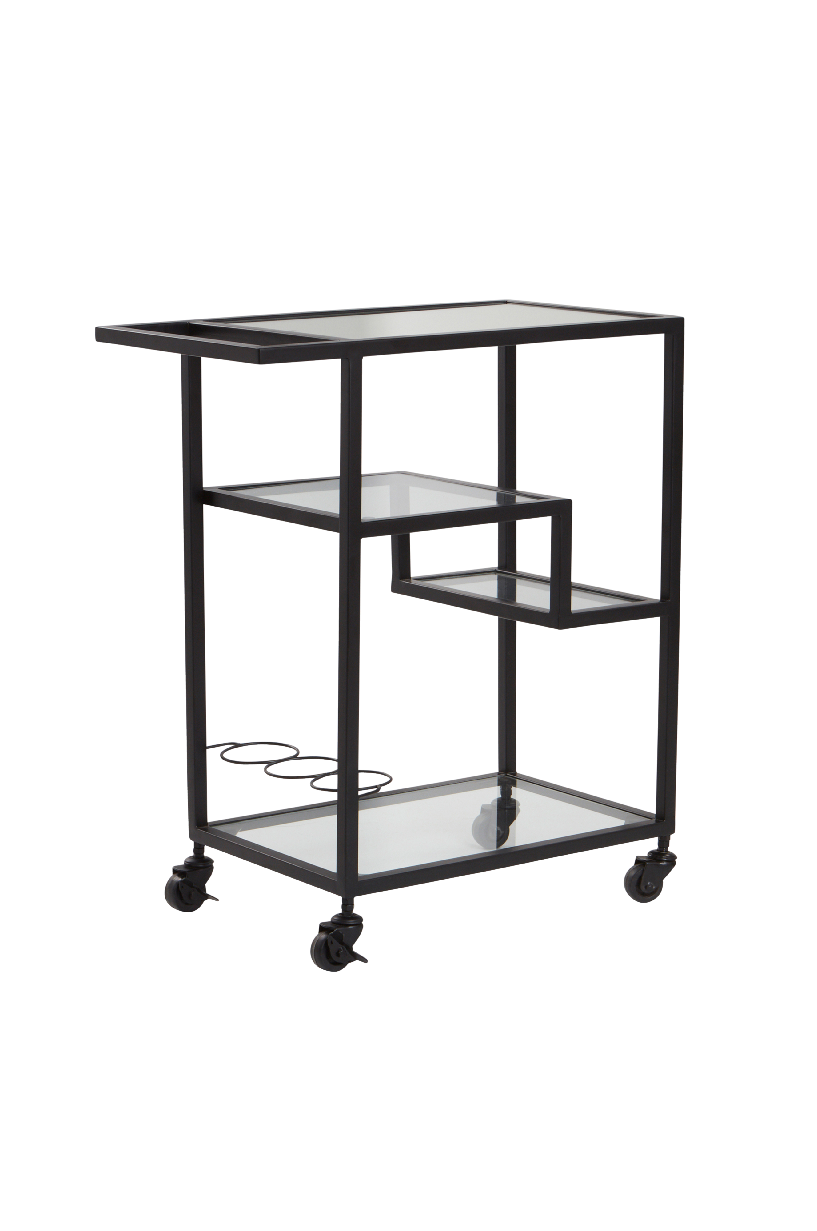 Een roltafel van gepoedercoat metaal met een bovenplaat en andere platen van helder glas. De roltafel is voorzien van mooie kleine wielen waardoor je deze makkelijk kunt verplaatsen. De toepassingsmogelijkheden zijn breed en je kunt hem als wand- of bijzettafel gebruiken. Enige montage is vereist. Handleiding voor montage wordt meegeleverd.