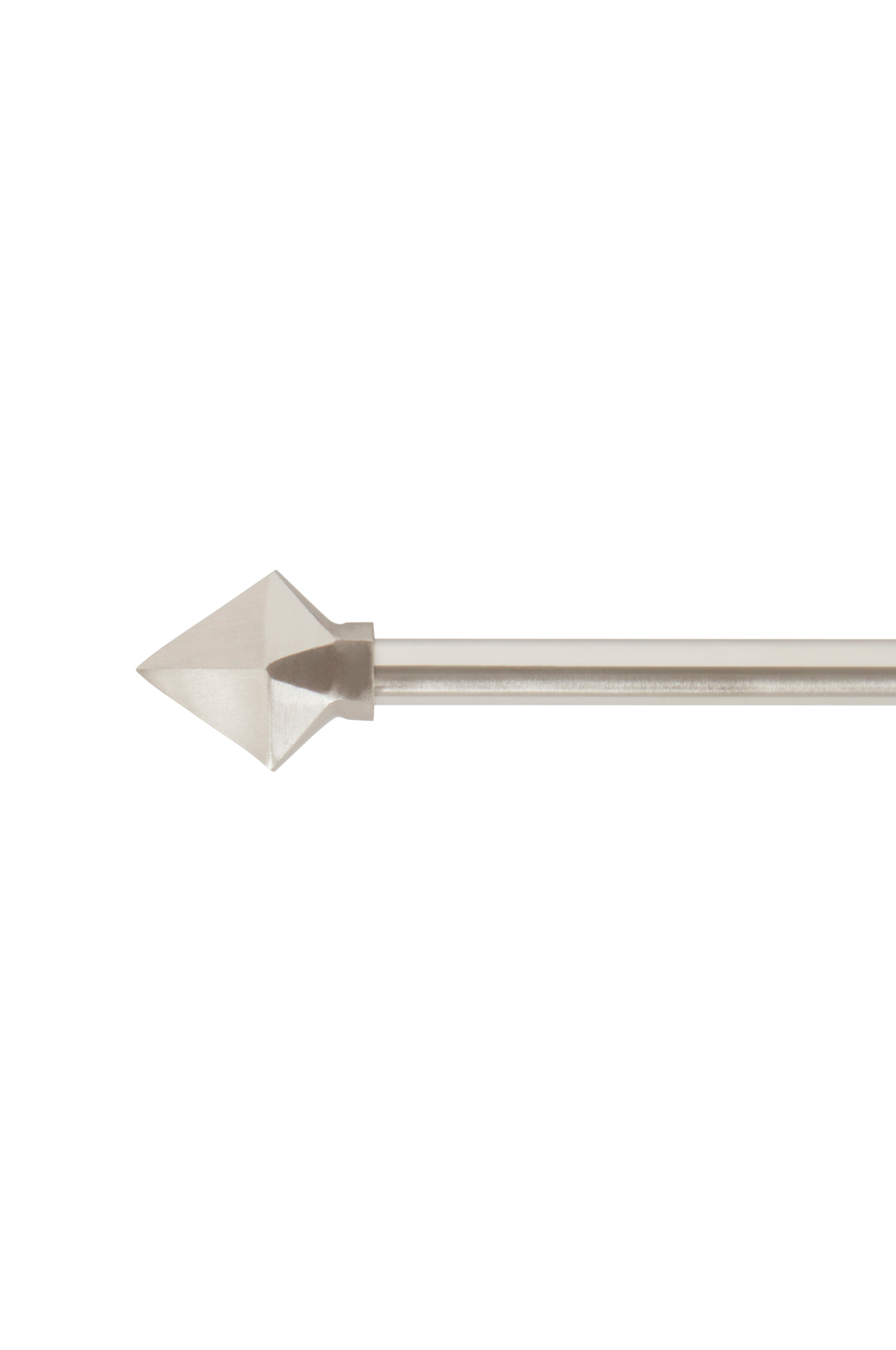 Een gordijnroede van staal met sierknoppen van gegoten aluminium. NEST heeft puntige, hoekige knoppen aan de uiteinden van de gordijnroede. De sierknoppen worden aan de gordijnroede vastgedraaid. Inclusief drie wandbevestigingen, pluggen en schroeven.