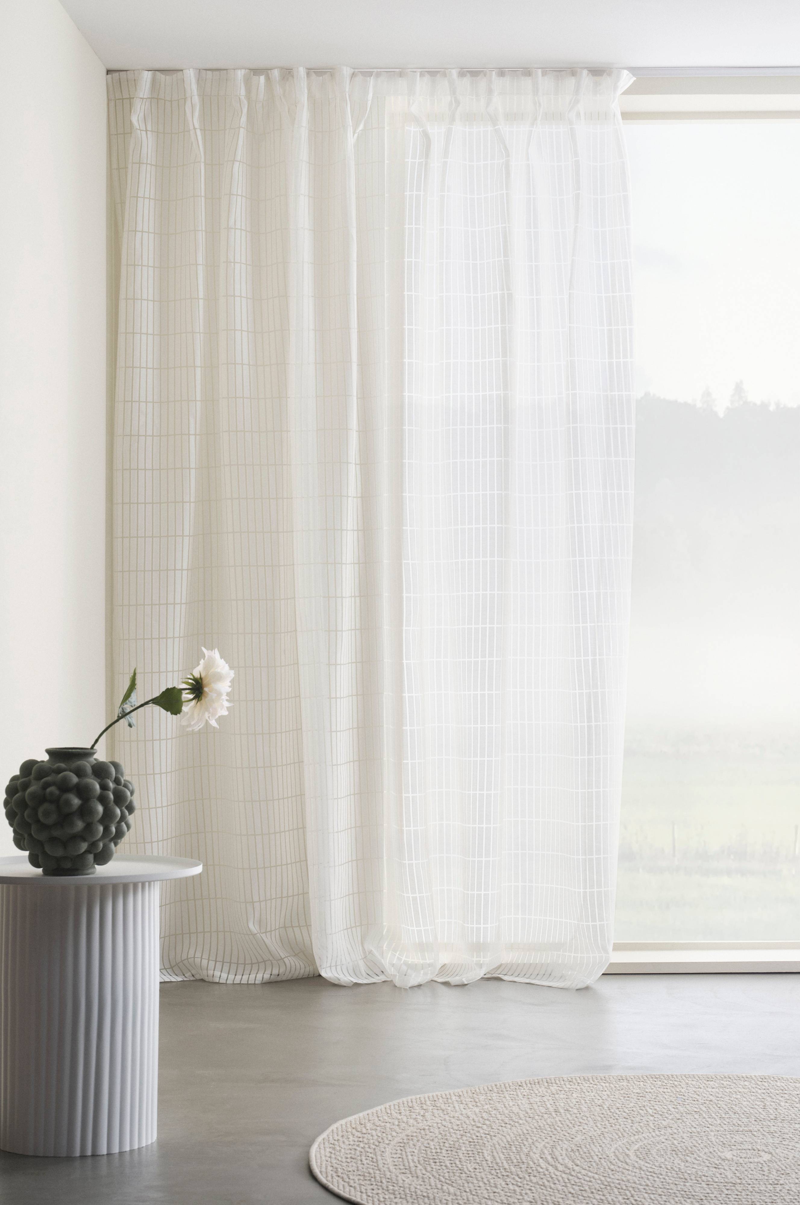 Een extra breed gordijn van een transparante, luchtige kwaliteit van viscose met een burn-out dessin dat deels transparant is. Een dun gordijn dat mooi valt. Het gordijn heeft een vastgestikt multifunctioneel gordijnband. Het gordijn kan met vingerhaken, roedetunnel of blinde lussen worden opgehangen.