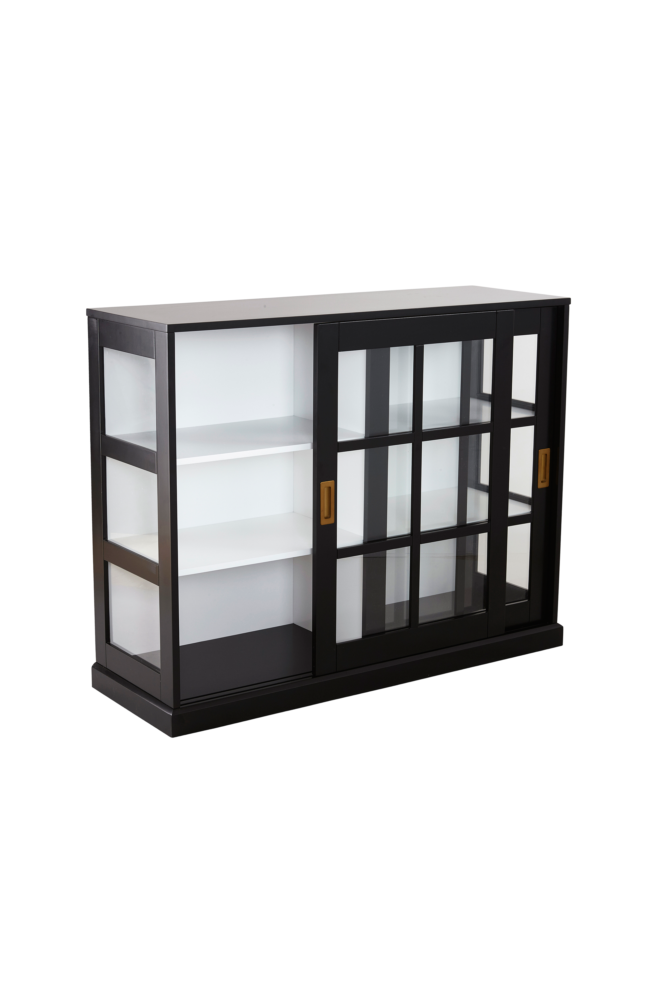 Omschrijving: Een vitrinekast in mdf met glazen schuifdeuren en beslag in messing. Wordt ongemonteerd geleverd. Montage-instructies worden meegeleverd.