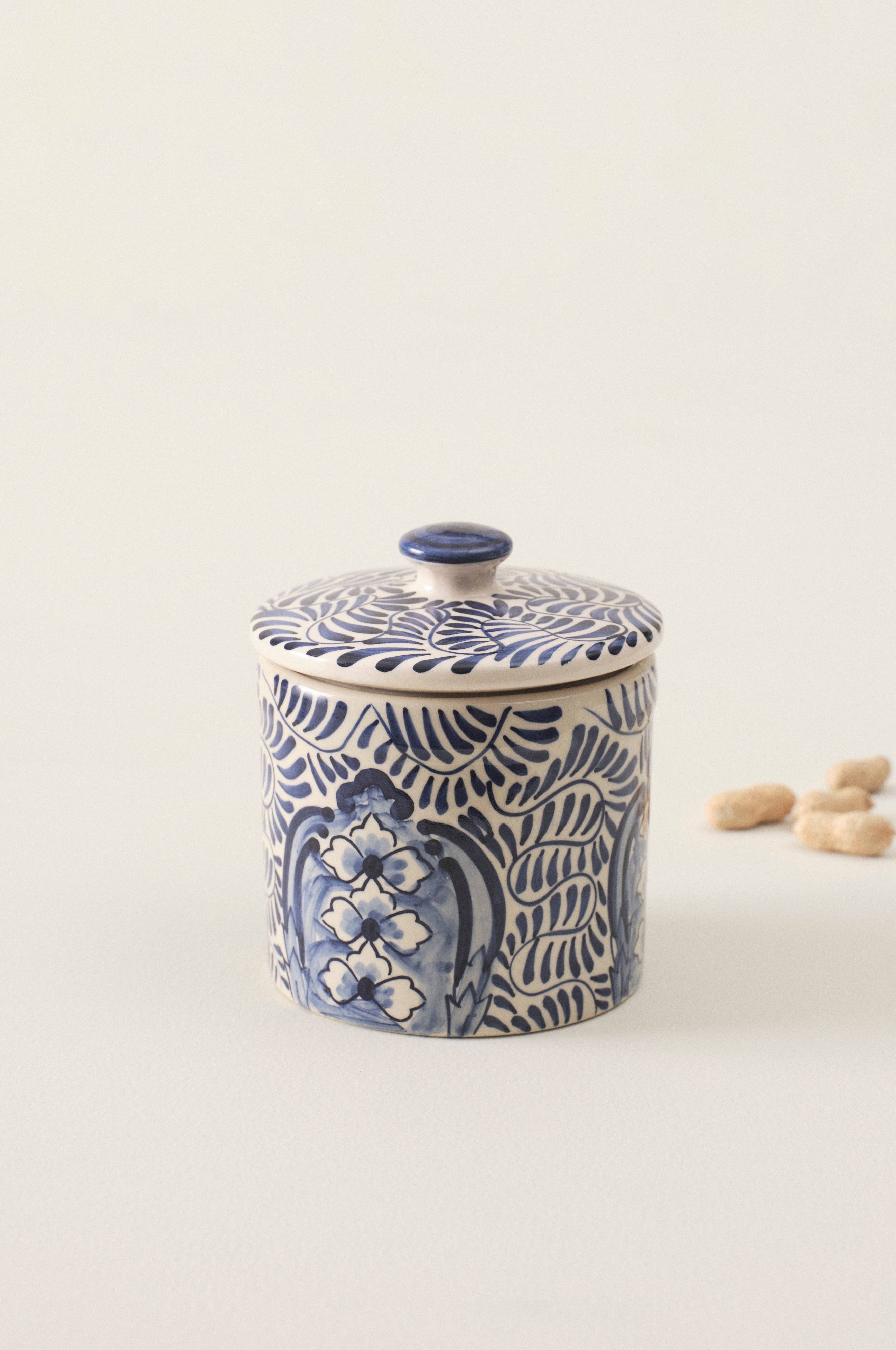 Potje met deksel, van keramiek met een handgeschilderde bloemendecoratie in blauwe kleuren op een natuurlijk witte ondergrond. De binnenkant is geglazuurd en effen natuurlijk wit. Het mooie handwerk met de handgeschilderde decoratie maakt ieder item uniek.