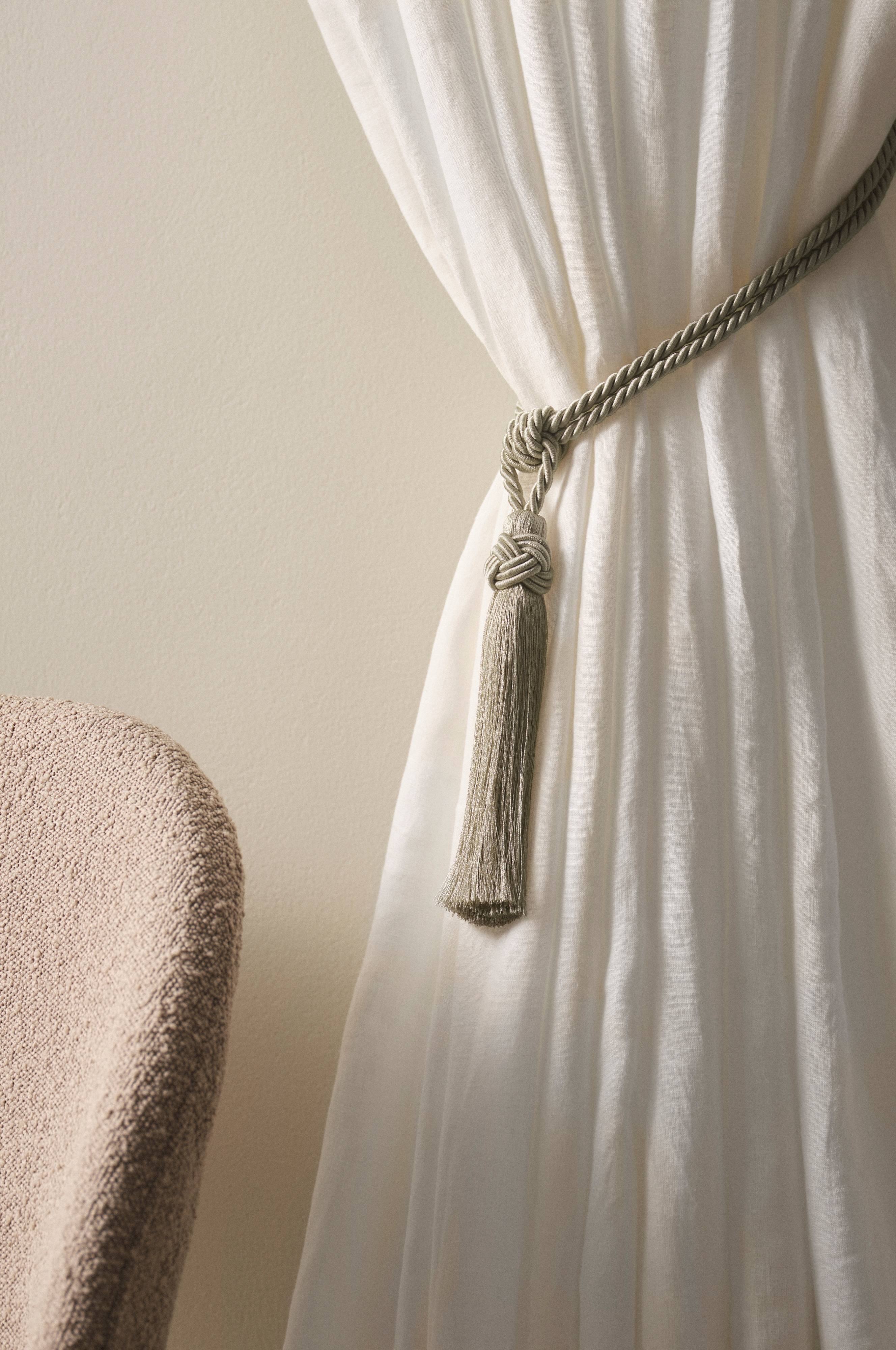 Een set van twee embrasses van polyester. NOOR heeft een fraai kwastje met bovenaan een gevlochten decoratie. Met embrasse NOOR drapeer je de gordijnen eenvoudig op een elegante manier.
