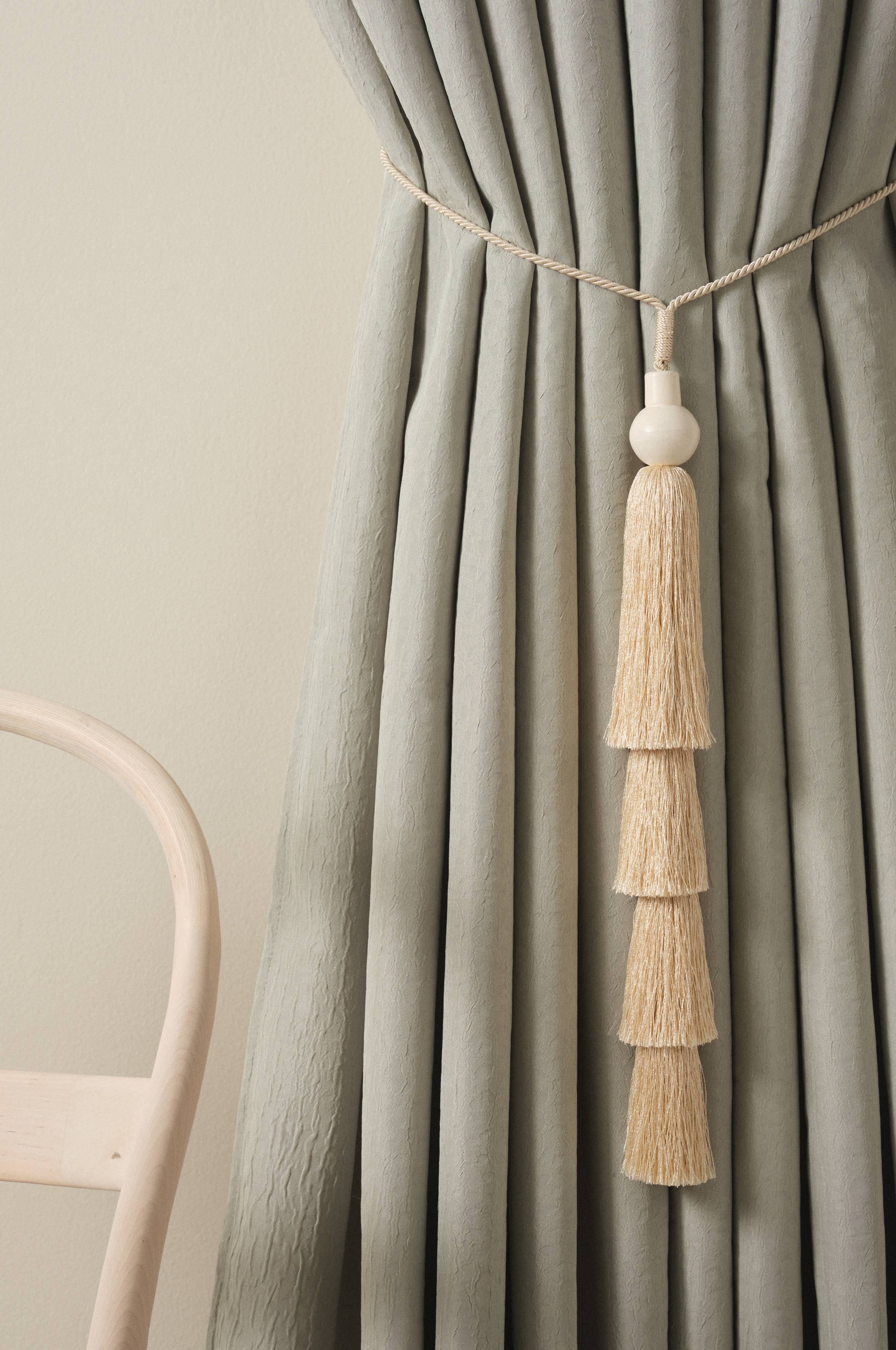 Een embrasse van polyester waarin katoen is verwerkt. NARU is een prachtige, effen embrasse met vier kwastjes boven elkaar met een ijzeren decoratie van ijzer boven elke kwast. Met deze kwastembrasse laat je de gordijnen op een mooie manier hangen.