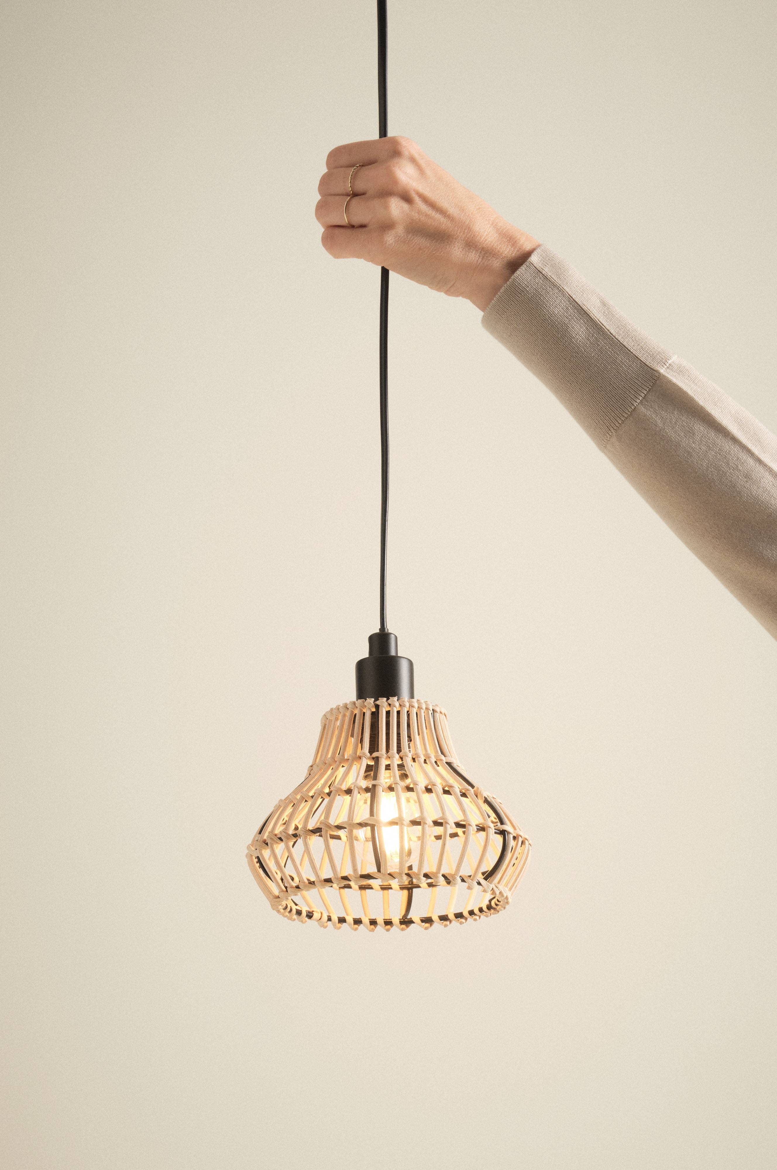 Een hanglamp van rotan met een zwart metalen frame. Zwart kunststof snoer met stekker en schakelaar. Hanglamp PALU verspreidt sfeervol licht en een enigszins bohemian gevoel. De lamp is ongeaard, klasse 2. De stekker is Europees, dat wil zeggen plat met dunnere pennen (4 mm).