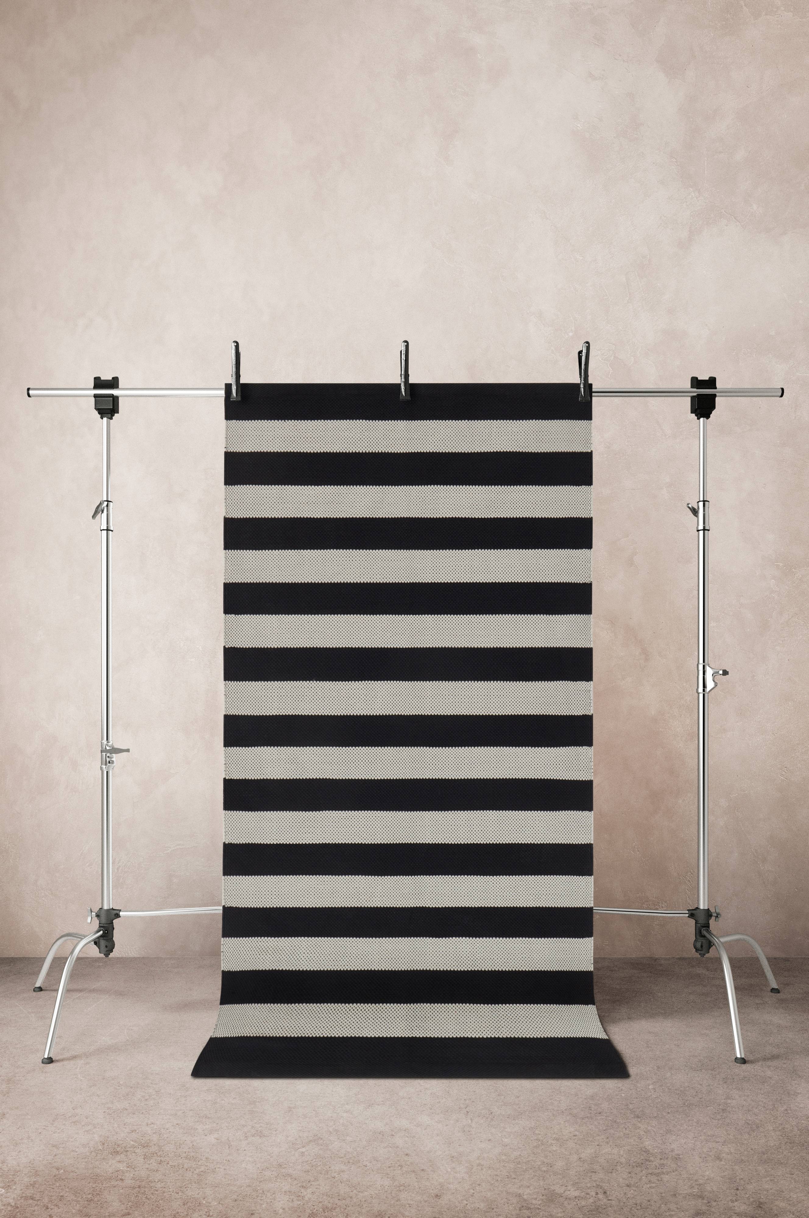 Vloerkleed van gerecycled polyester met garenkleurige blokstrepen. Dit is een comfortabele kwaliteit die aanvoelt en eruitziet als katoen, maar gemaakt is van gerecycled polyester. Een heerlijk vloerkleed dat je zowel binnen als buiten kunt gebruiken.