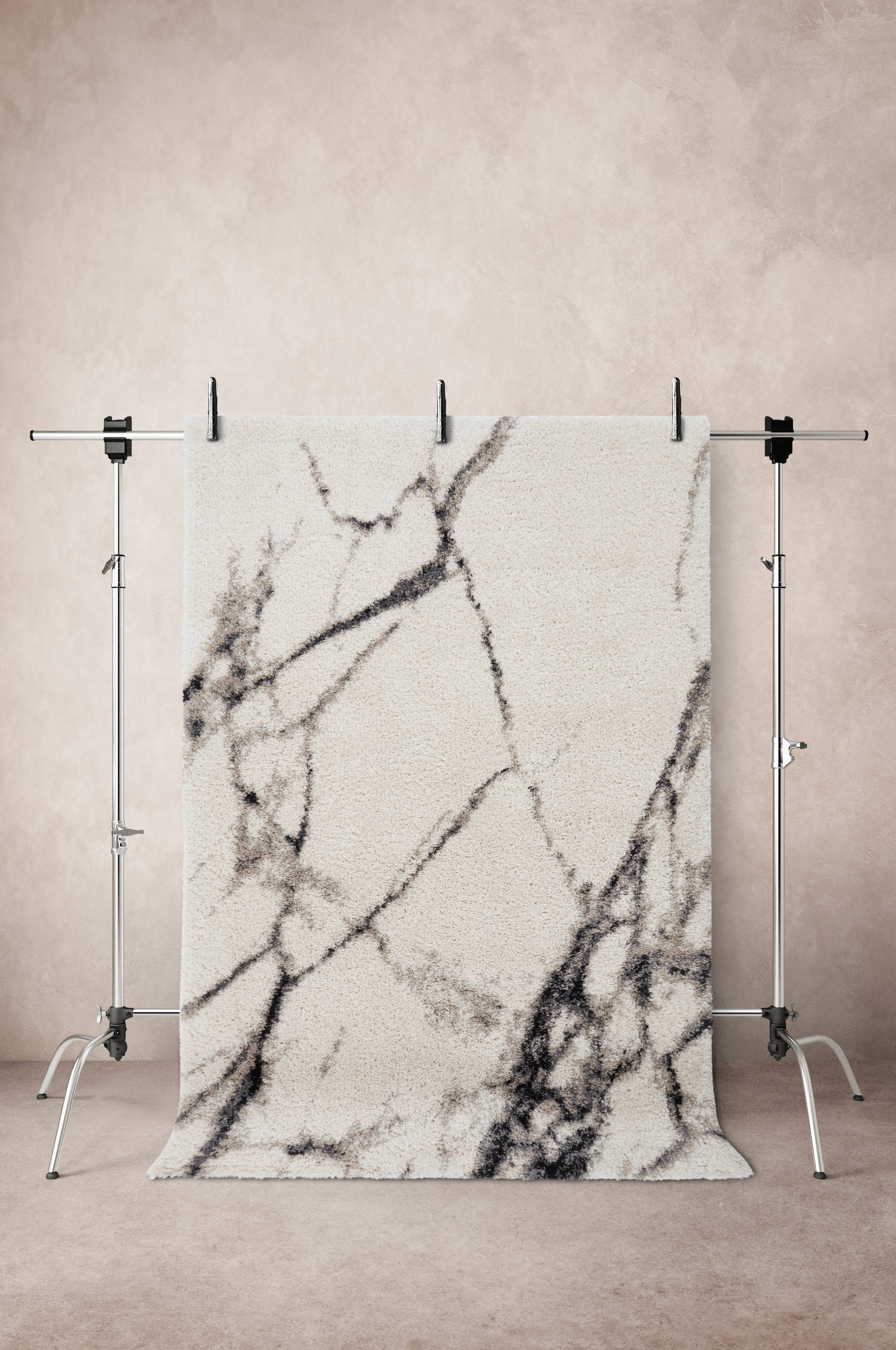 Een hoogpolig vloerkleed met een schitterend marmerdessin op een lichte ondergrond. Het vloerkleed heeft een dichte, hoge pool van heerlijk zacht garen. Poolhoogte 3,5 cm. Dikte 3,8 cm. 2400 gr./m².