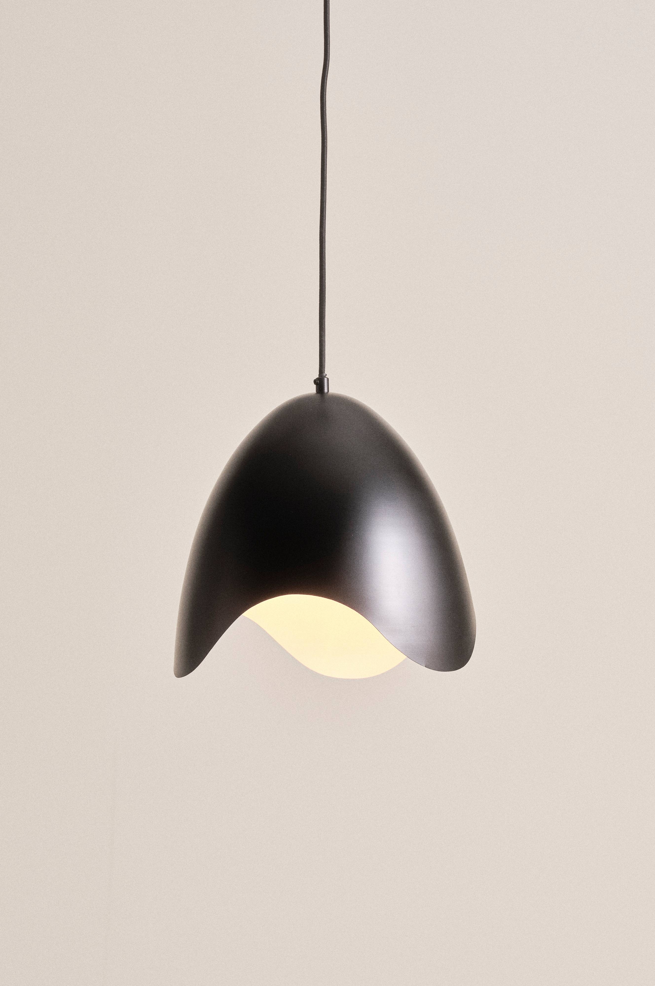 Een hanglamp in een prachtige vormgeving met zachte, ronde lijnen die de lamp een retrolook geven. De lamp is van ijzer met een matte poedercoating. De lichte binnenkant van de kap reflecteert het licht op een aangename manier.