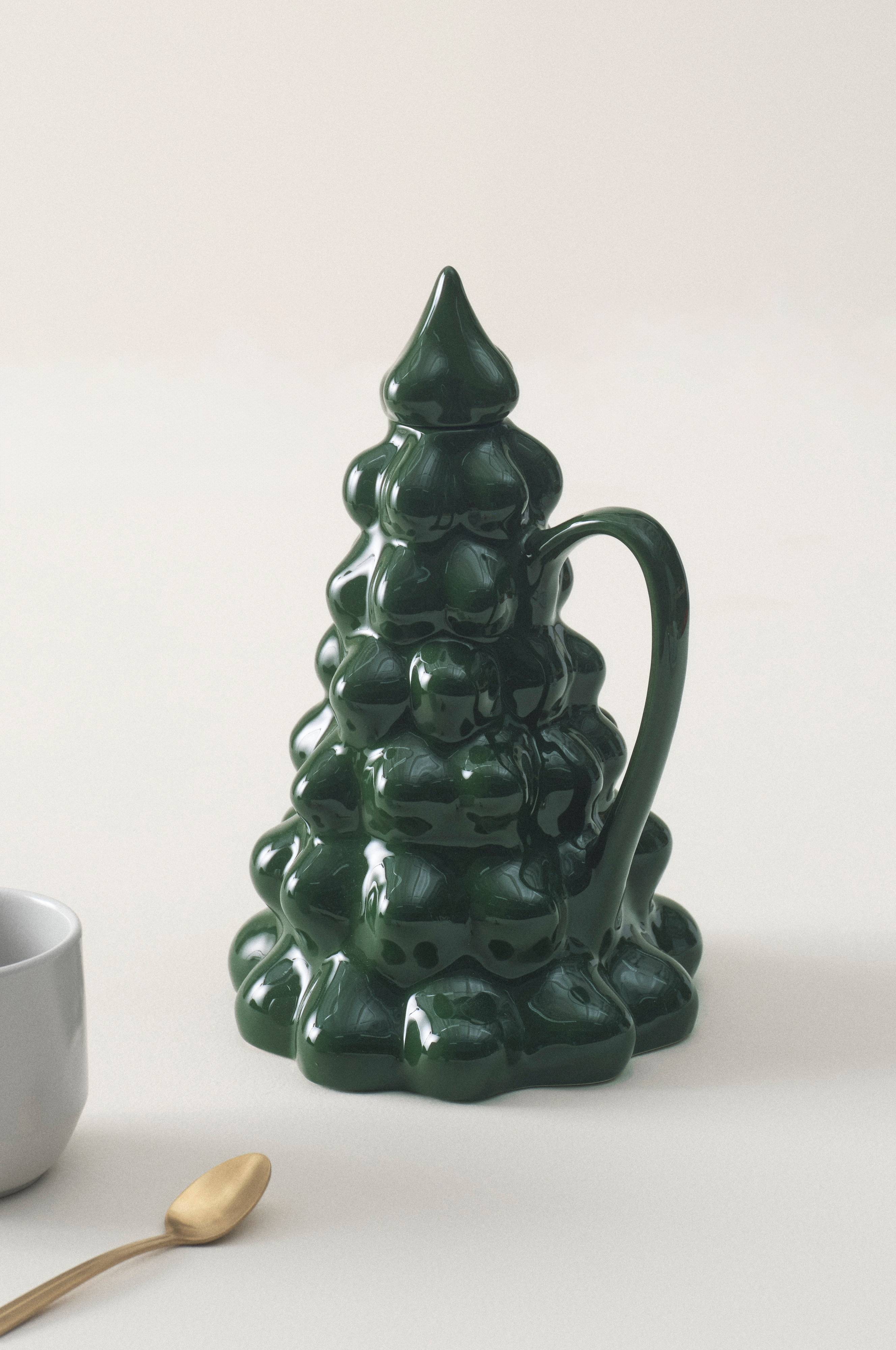 Een kan van dolomietporselein. De handgemaakte kan in de vorm van een dennenboom heeft een schenktuitje en een handgreep die makkelijk vast te pakken is, zodat je handig kunt schenken. De dennenboom heeft een glanzende, kerstboomgroene glazuurlaag. De kan zorgt voor een gezellige kerstsfeer op je gedekte tafel.