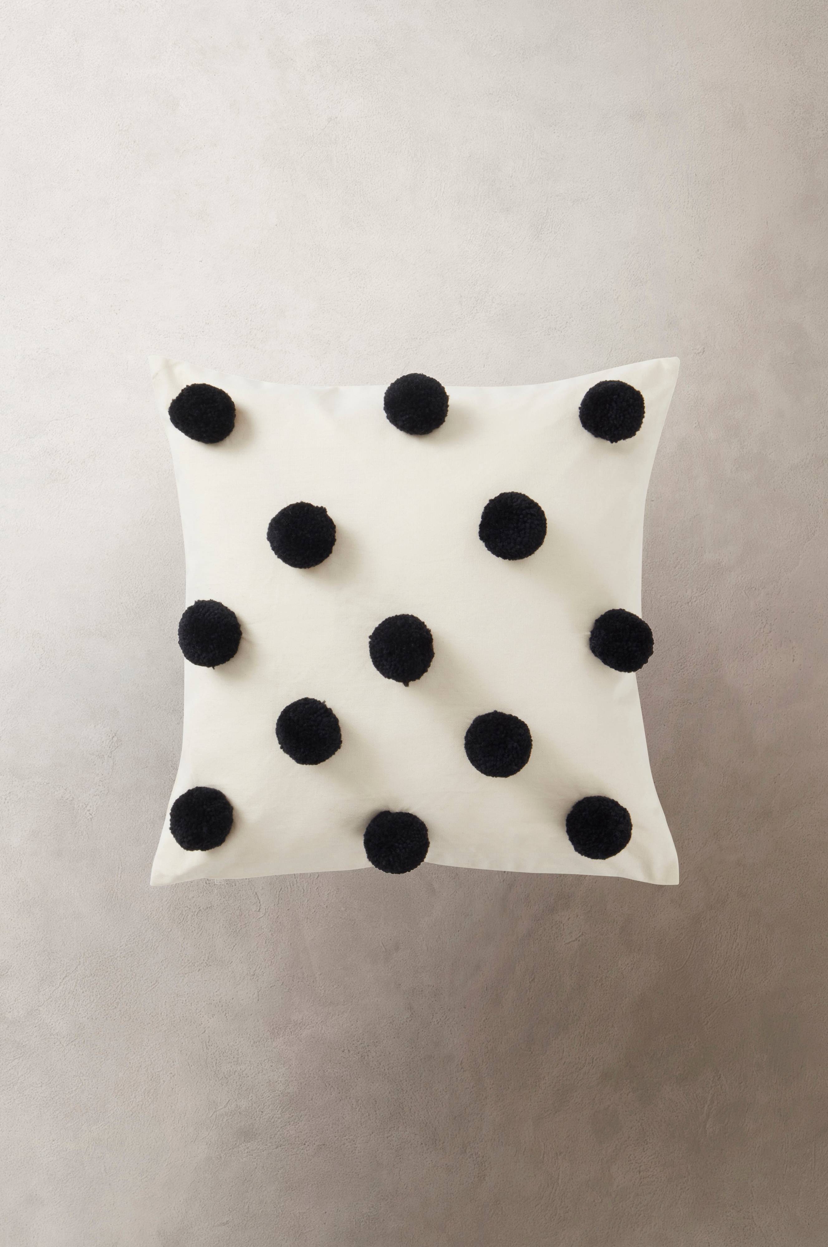 Een kussenhoes van katoenen canvas met decoratieve pompons op de voorkant. De achterkant is effen en van dezelfde kwaliteit als de voorkant. Ritssluiting aan de onderkant.