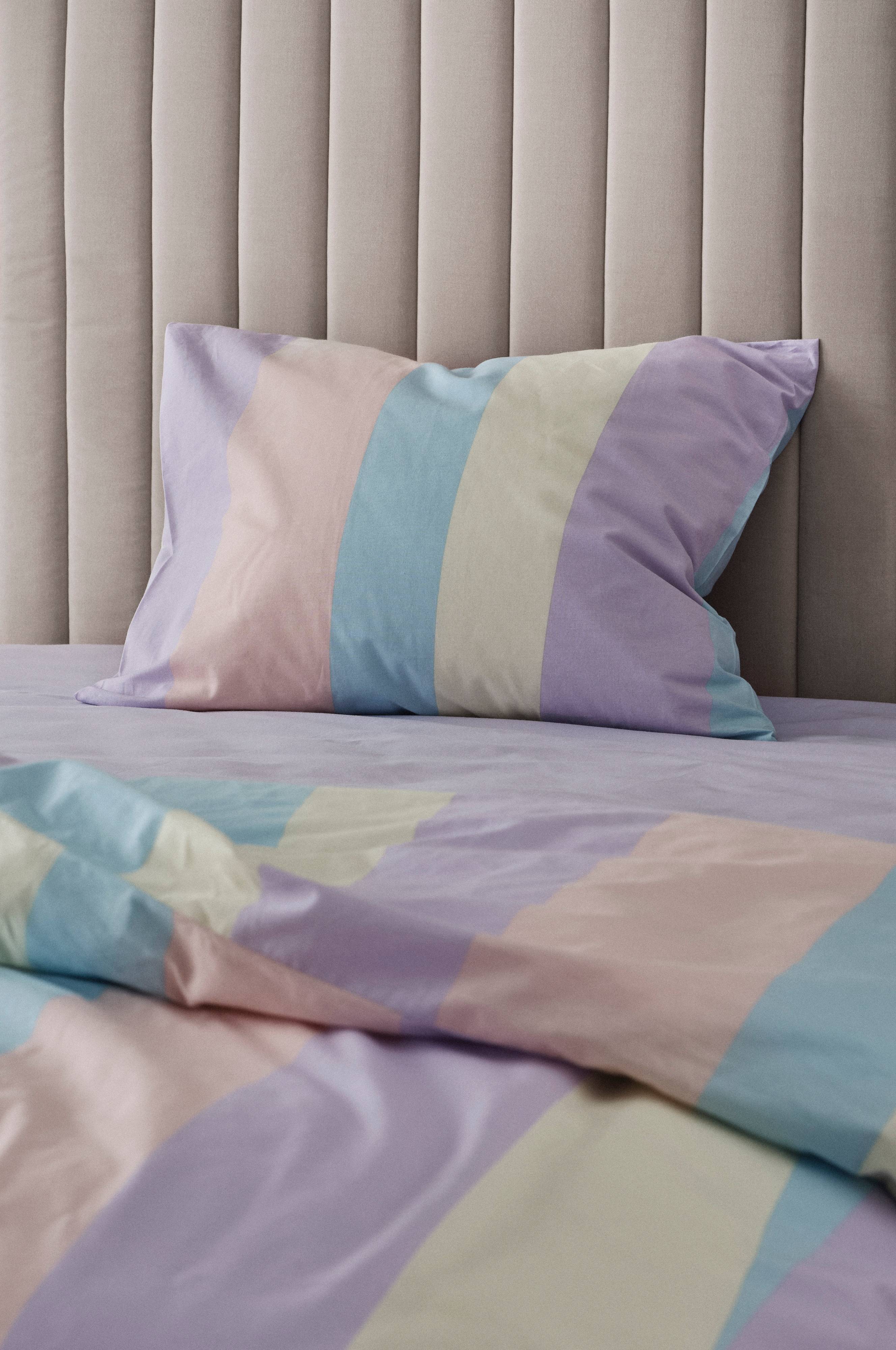 Een kussensloop van zacht, gestreept katoen. Katoen is heerlijk koel om in te slapen, bovendien heeft de stof een behandeling ondergaan waardoor het heerlijk zacht is. De onregelmatige strepen zijn uitgevoerd in verrukkelijke pastelkleuren, waardoor de strepen van de verschillende onderdelen in deze beddengoedserie kunnen variëren. Draaddichtheid 144. (De draaddichtheid geeft het aantal draden aan per vierkante inch van een stof. Hoe hoger de draaddichtheid, hoe hoger de kwaliteit.)