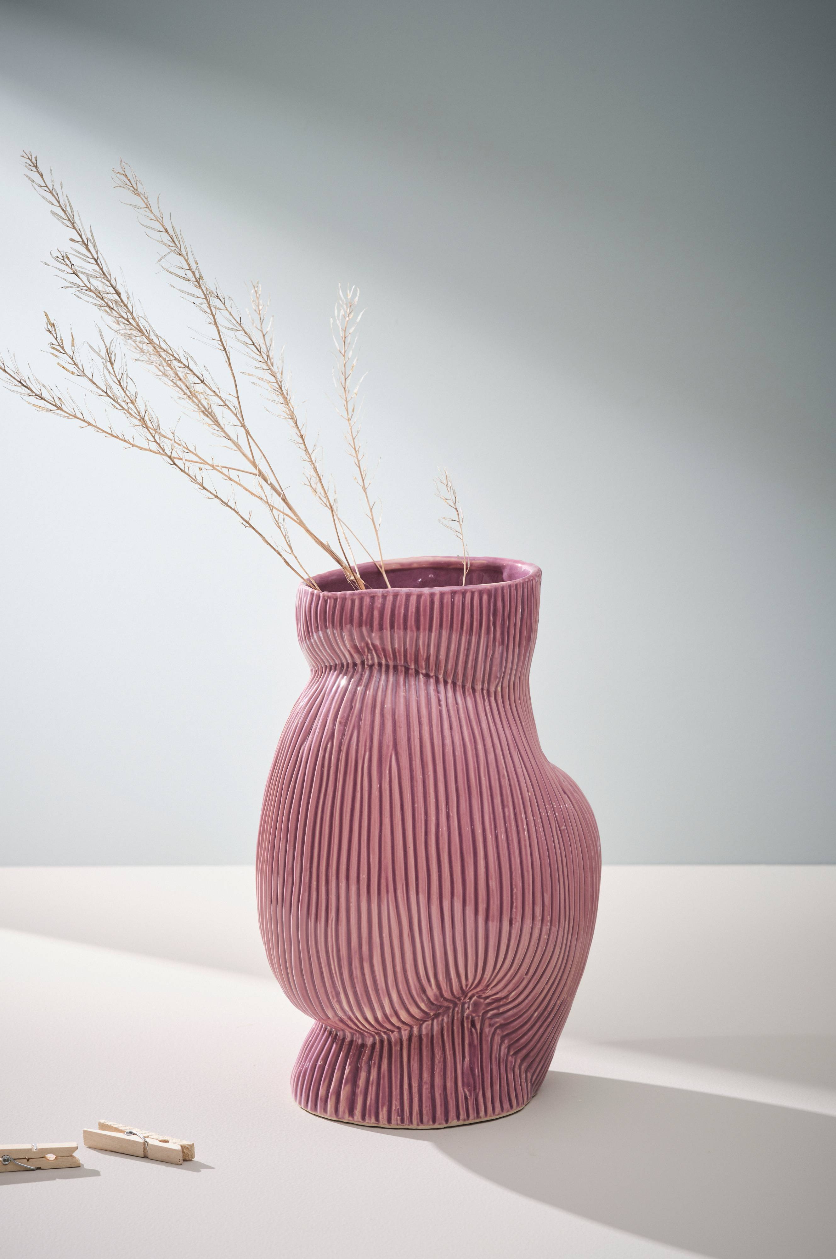 Een handgemaakte decoratieve vaas van keramiek. Een stijlvolle vaas met een bijzondere vorm en een geribbeld oppervlak. Ook de binnenkant is geglazuurd. De vaas is handgemaakt, dus het uiterlijk kan van product tot product variëren. Keramiek kan vocht doorlaten.