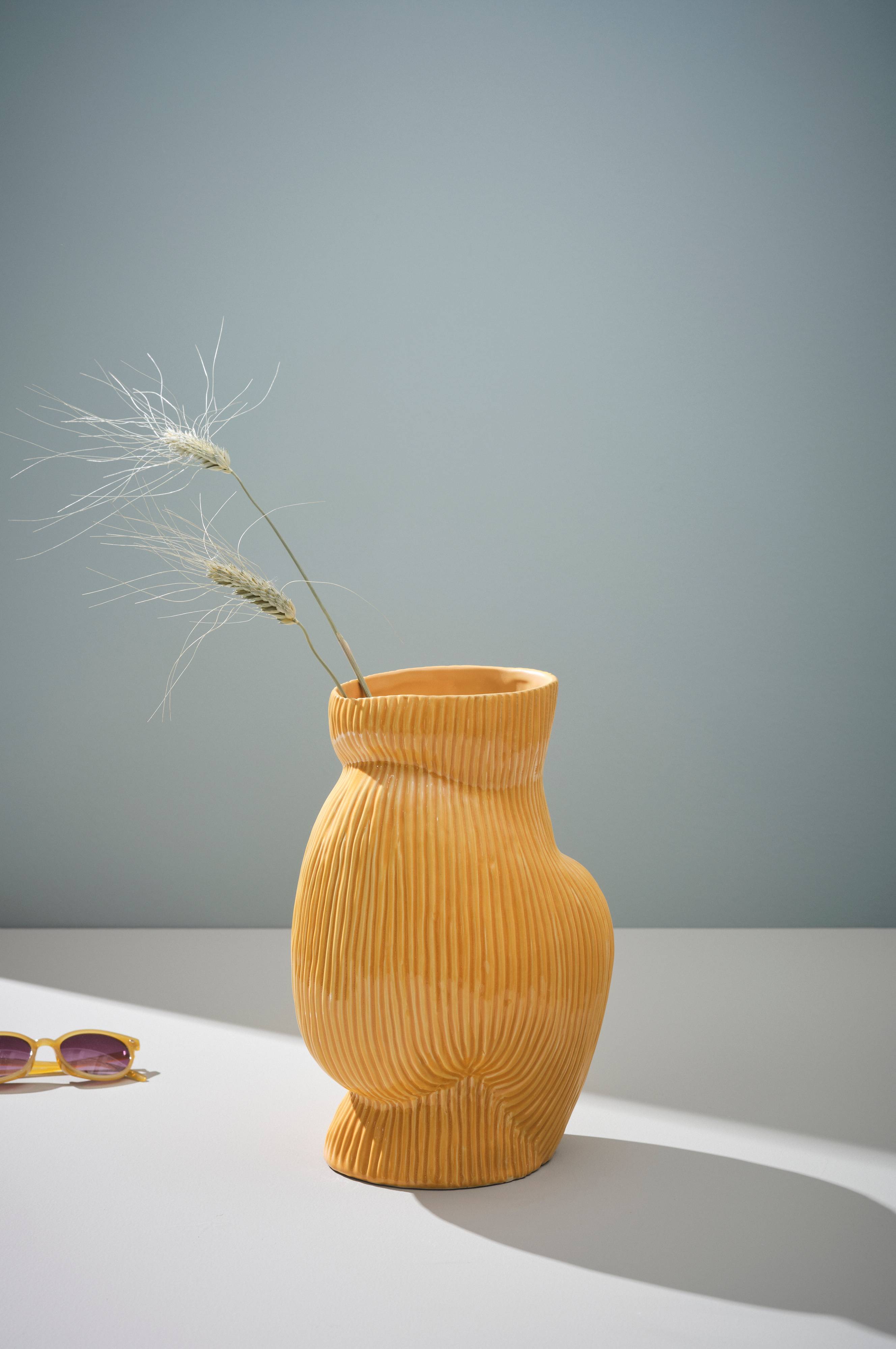 Een handgemaakte decoratieve vaas van keramiek. Een stijlvolle vaas met een bijzondere vorm en een geribbeld oppervlak. Ook de binnenkant is geglazuurd. De vaas is handgemaakt, dus het uiterlijk kan van product tot product variëren. Keramiek kan vocht doorlaten.