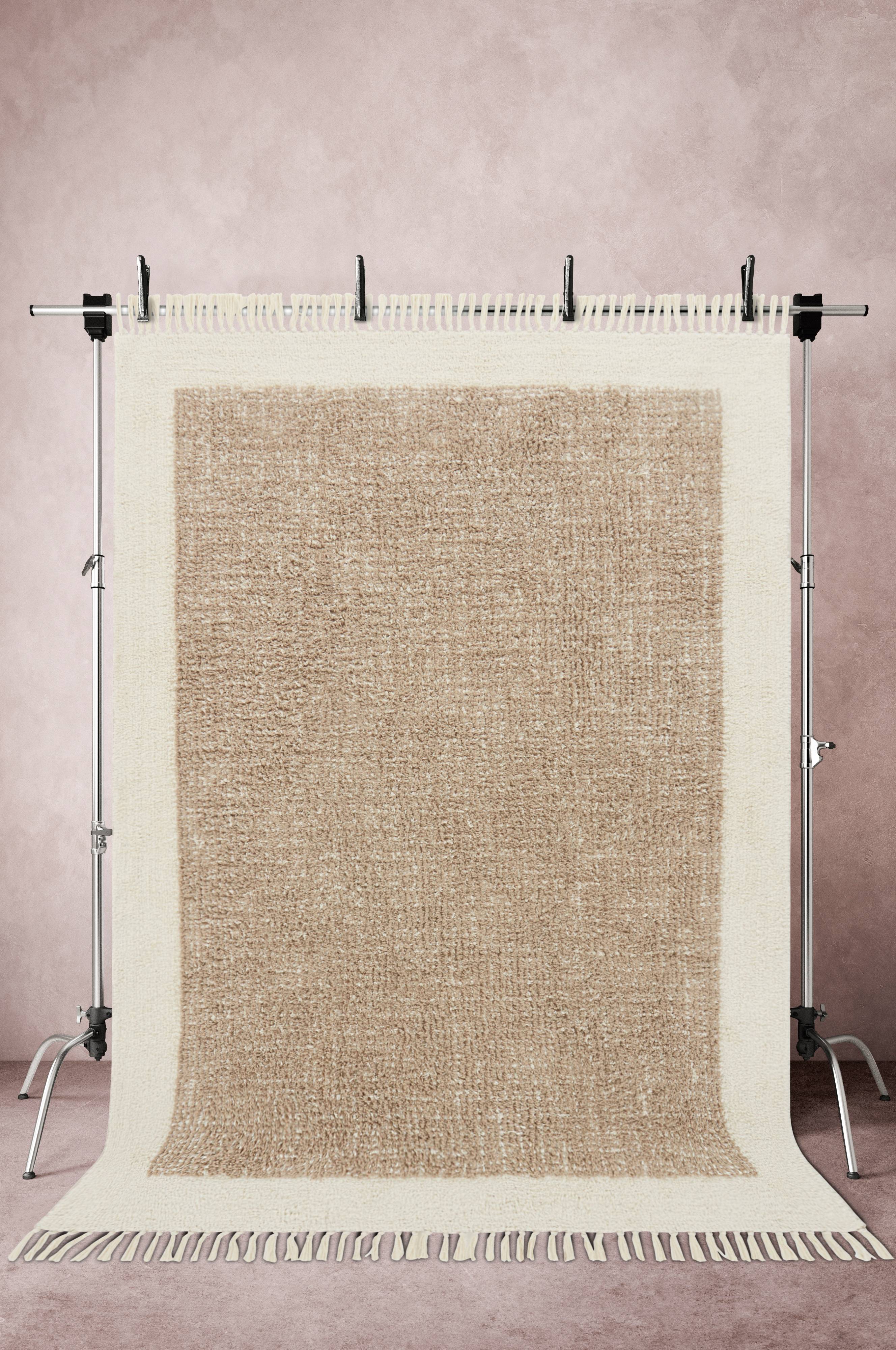 Een getuft katoenen vloerkleed van een soepele kwaliteit die heerlijk zacht aanvoelt. Het vloerkleed heeft een tweekleurige pool en de rand rondom heeft een effen kleur en is iets minder hoog. Het vloerkleed heeft franje aan de korte zijden. Lengte franje 8 cm. Poolhoogte 1 cm. Dikte 1,1 cm. 1600 gr./m².