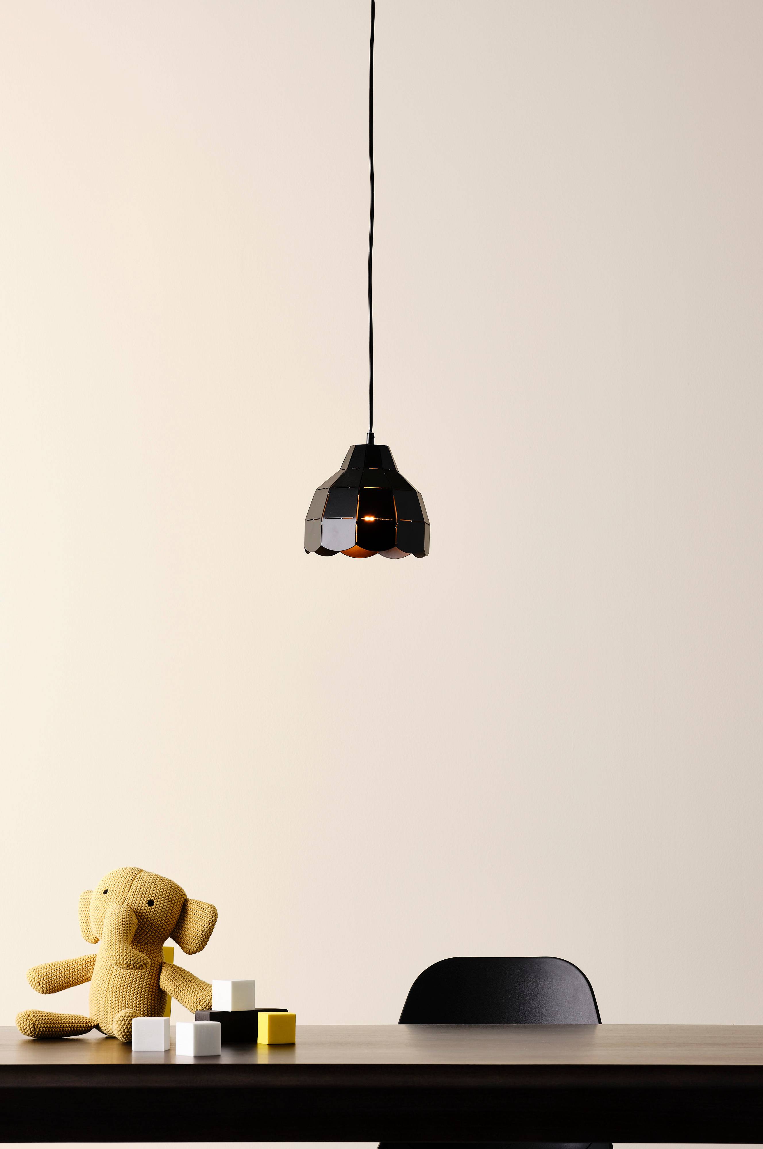 Een hanglamp van gekleurd ijzer met details die met laser zijn uitgesneden. Een stoere lamp die een fraai detail is voor de kinderkamer. Zwart snoer, snoerlengte 1 meter. Exclusief plafondstekker op grond van nieuwe EU-regelgeving. Een plafondstekker is los verkrijgbaar en heet THE ROOF plafondstekker.