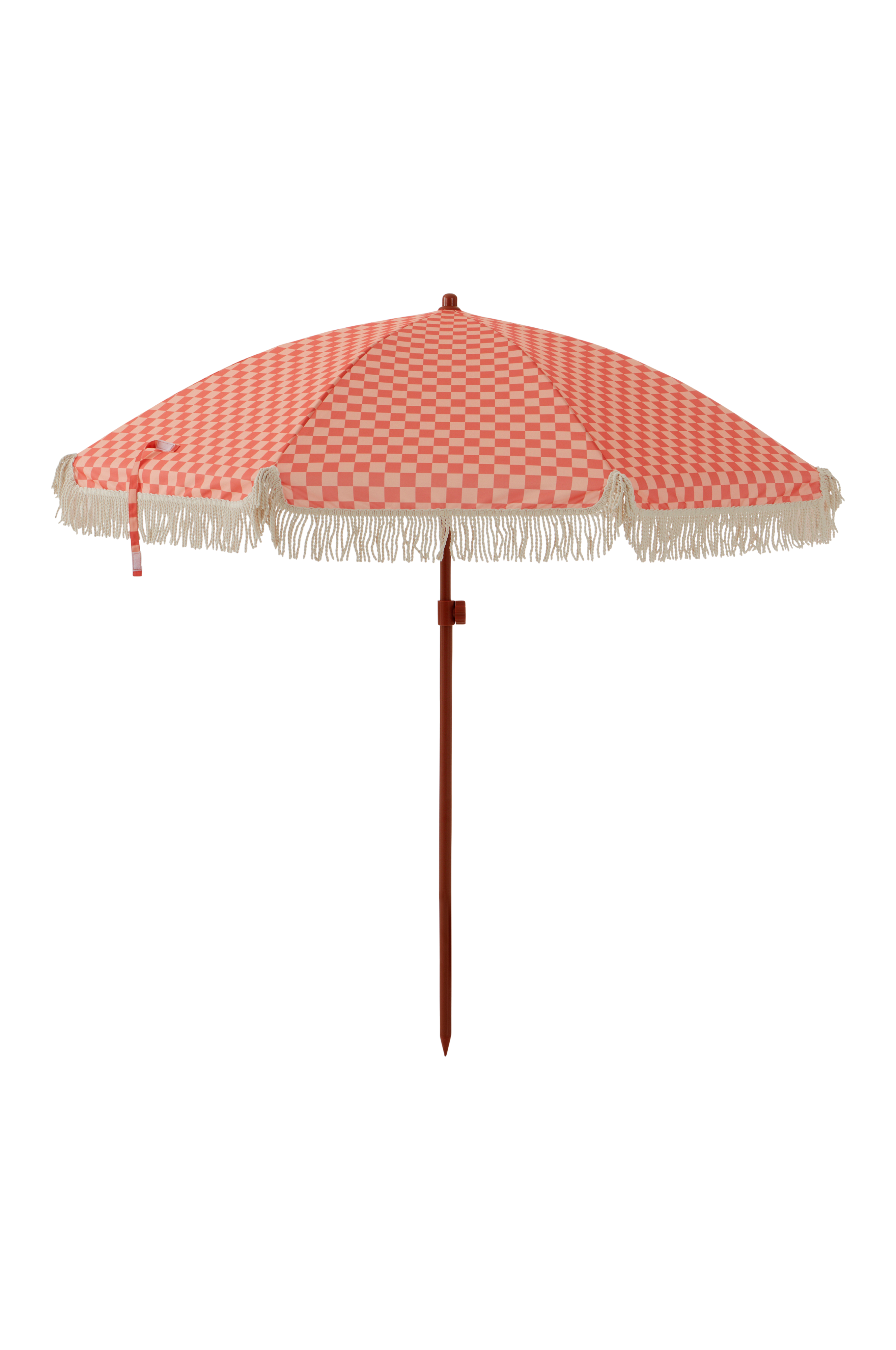 QUINTA is een geruite parasol van staal met een waterafstotende stof van polyester en franje van polyester/katoen. De stalen stok kan in het midden gekanteld worden, zodat de schaduw op de juiste plek valt. Inclusief grondpen om de parasol in de grond/het zand te plaatsen. Opbergtas met handvat wordt meegeleverd. Wordt geleverd zonder parasolvoet, die wordt apart verkocht.