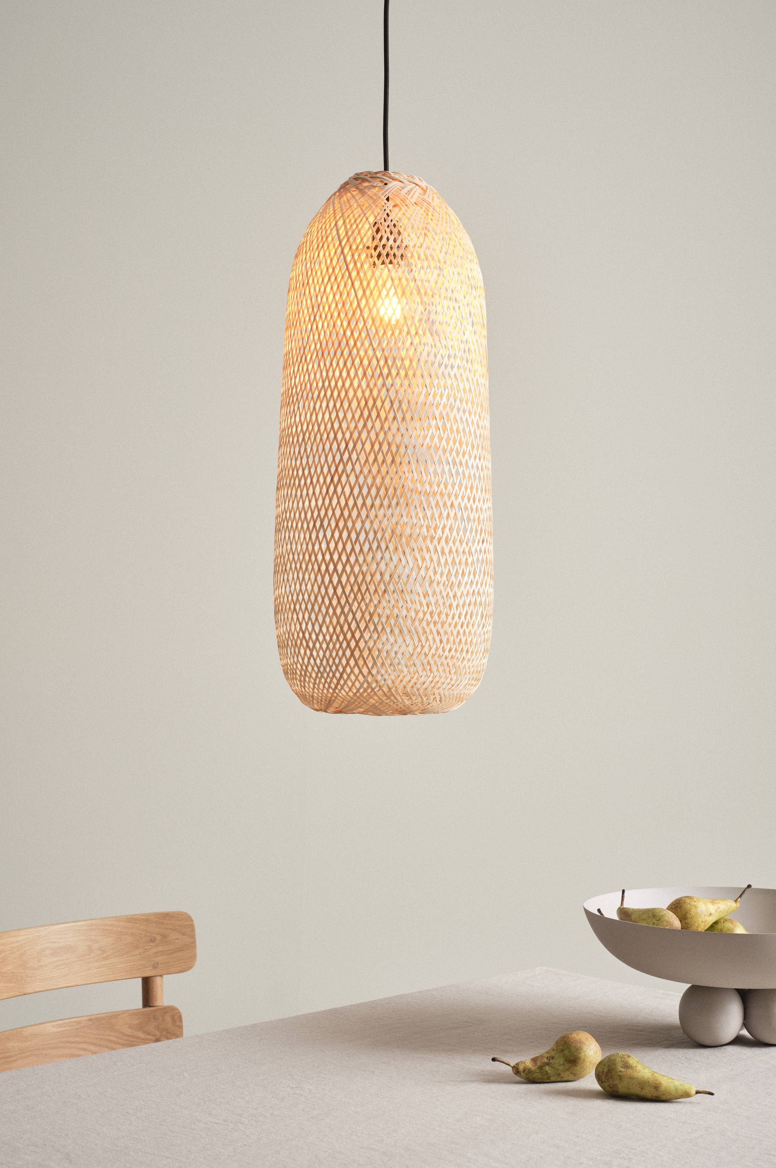 Een hanglamp met een scherm van gevlochten bamboe in een zachte vorm. Het vlechtwerk in combinatie met het natuurlijke materiaal zorgt ervoor dat de lamp een sfeervol licht verspreidt. De lamphouder en het snoer zijn decoratief zwart, het textielsnoer heeft een degelijke look-and-feel. Plafondcup van plastic. De lamp is ongeaard, klasse 2. Op grond van EU-regelgeving is er in sommige landen een losse plafondstekker nodig. De plafondstekker moet ongeaard zijn (klasse 2) en wordt los verkocht.
