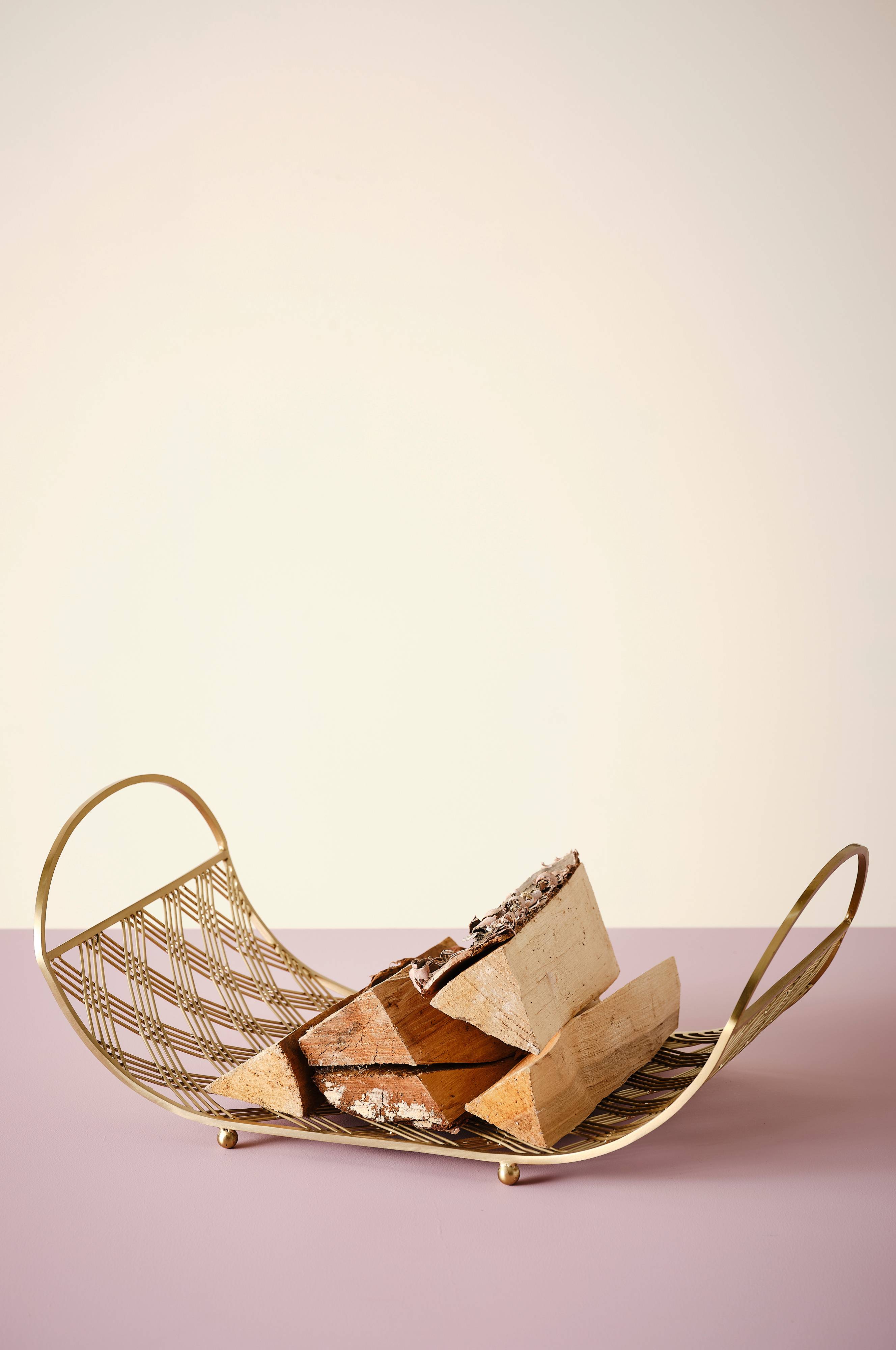 Een hout-/tijdschriftenmand van metaal met een goudkleurige afwerking. REIDAR is een praktische opbergplek die tegelijkertijd een mooi interieurdetail is.