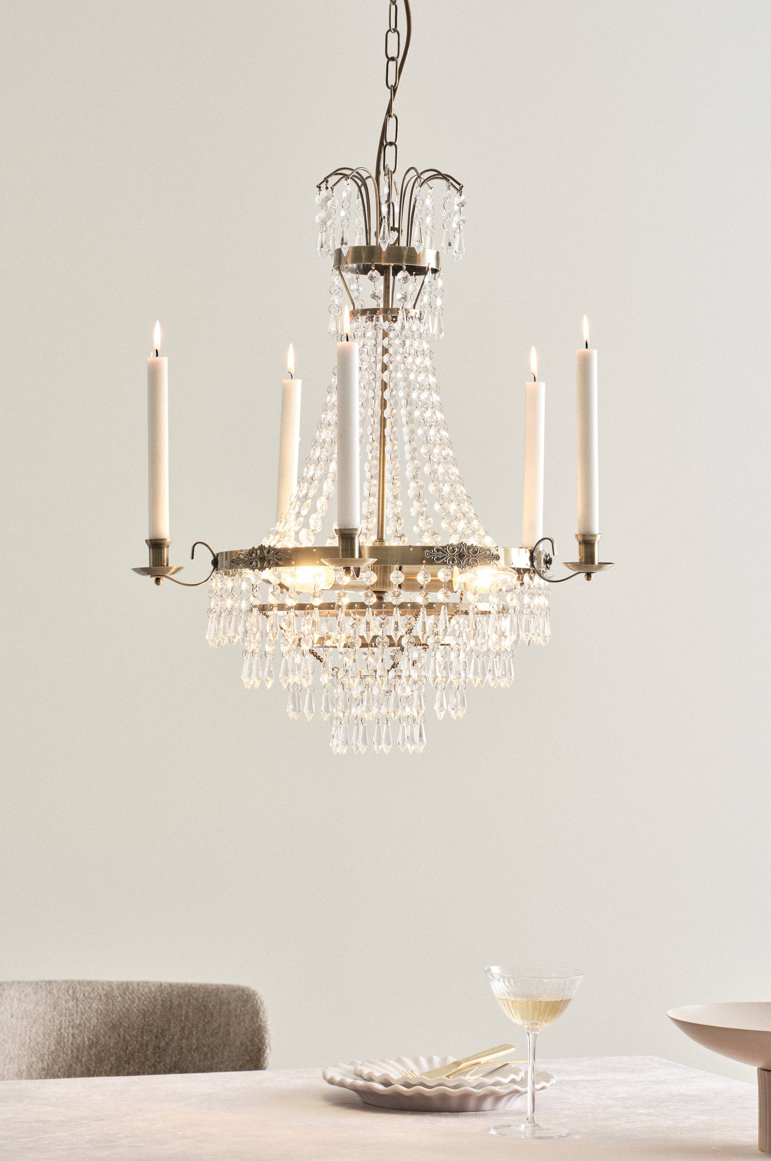 Een prachtige kristallen kroonluchter in een klassiek empiremodel met kaarshouders. De prisma's zijn gemaakt van geslepen glas. De plafondkap heeft dezelfde kleur als de kroonluchter. Afstand van het plafond 108 cm, waarvan 52 cm ketting die ingekort kan worden. Drie lamphouders. Vijf kaarshouders. Hoogte 60 cm zonder ketting, ø ca. 50 cm. E14-fitting, max. 40W. Lampen/kroonkaarsen. Exclusief plafondstekker op grond van nieuwe EU-regelgeving. Een plafondstekker is los verkrijgbaar en heet ROOF EARTH plafondstekker.