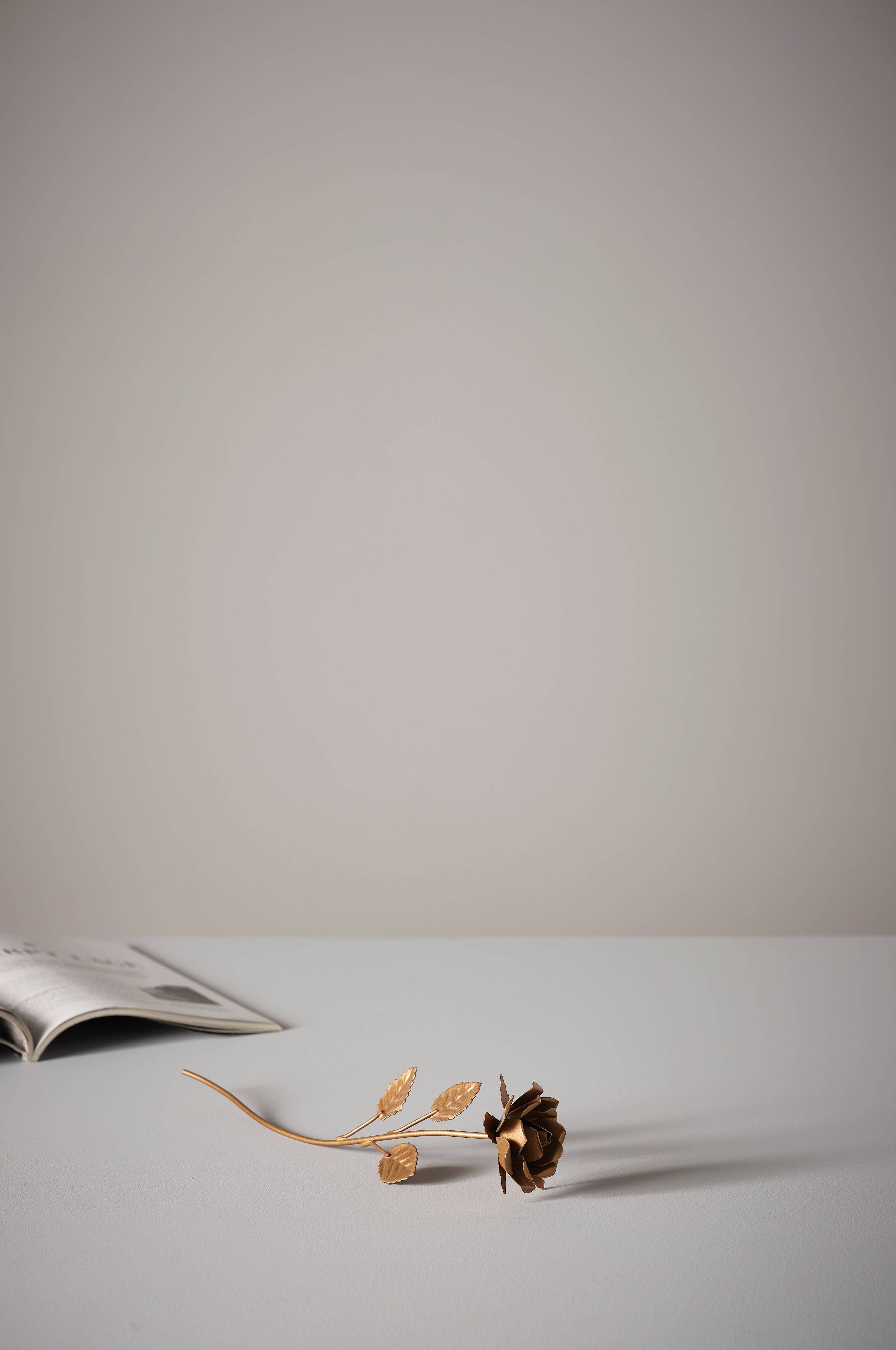 Een decoratieve roos van gepoedercoat of geplateerd metaal. Een roos in volle bloei die nooit verwelkt. Mooi in een minimalistisch zwart-wit interieur of om een romantische sfeer te versterken.