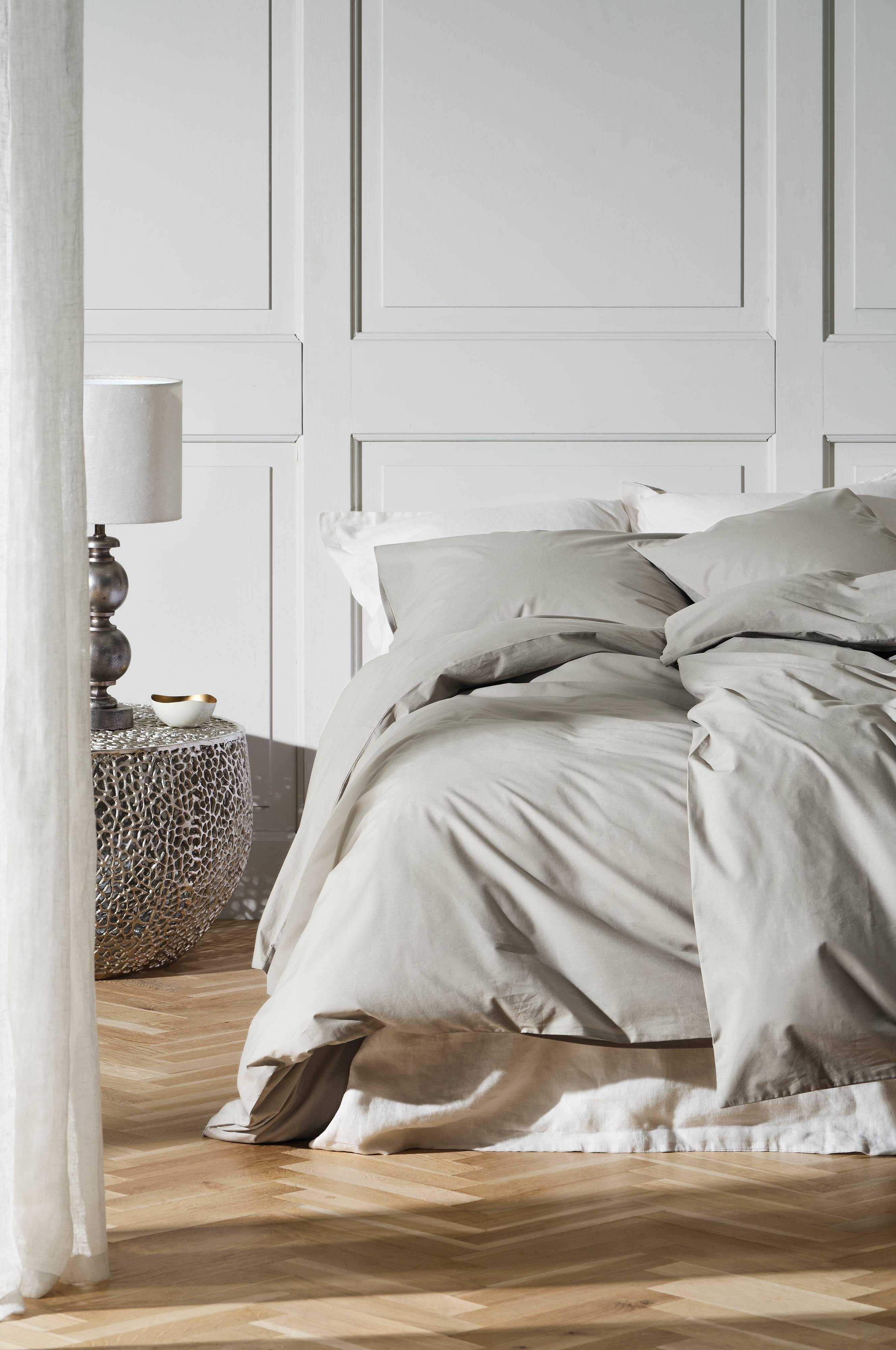 Een effen dekbedovertrek van biologisch katoenen perkal. Een extra zachte, knisperende dekbedovertrekset van fijngeweven perkalkatoen van dun garen. Dankzij de opening in de bovenhoeken van het dekbedovertrek kan het gemakkelijker over het dekbed getrokken worden. Draaddichtheid 200. (De draaddichtheid geeft het aantal draden aan per vierkante inch van een stof. Hoe hoger de draaddichtheid, hoe hoger de kwaliteit).