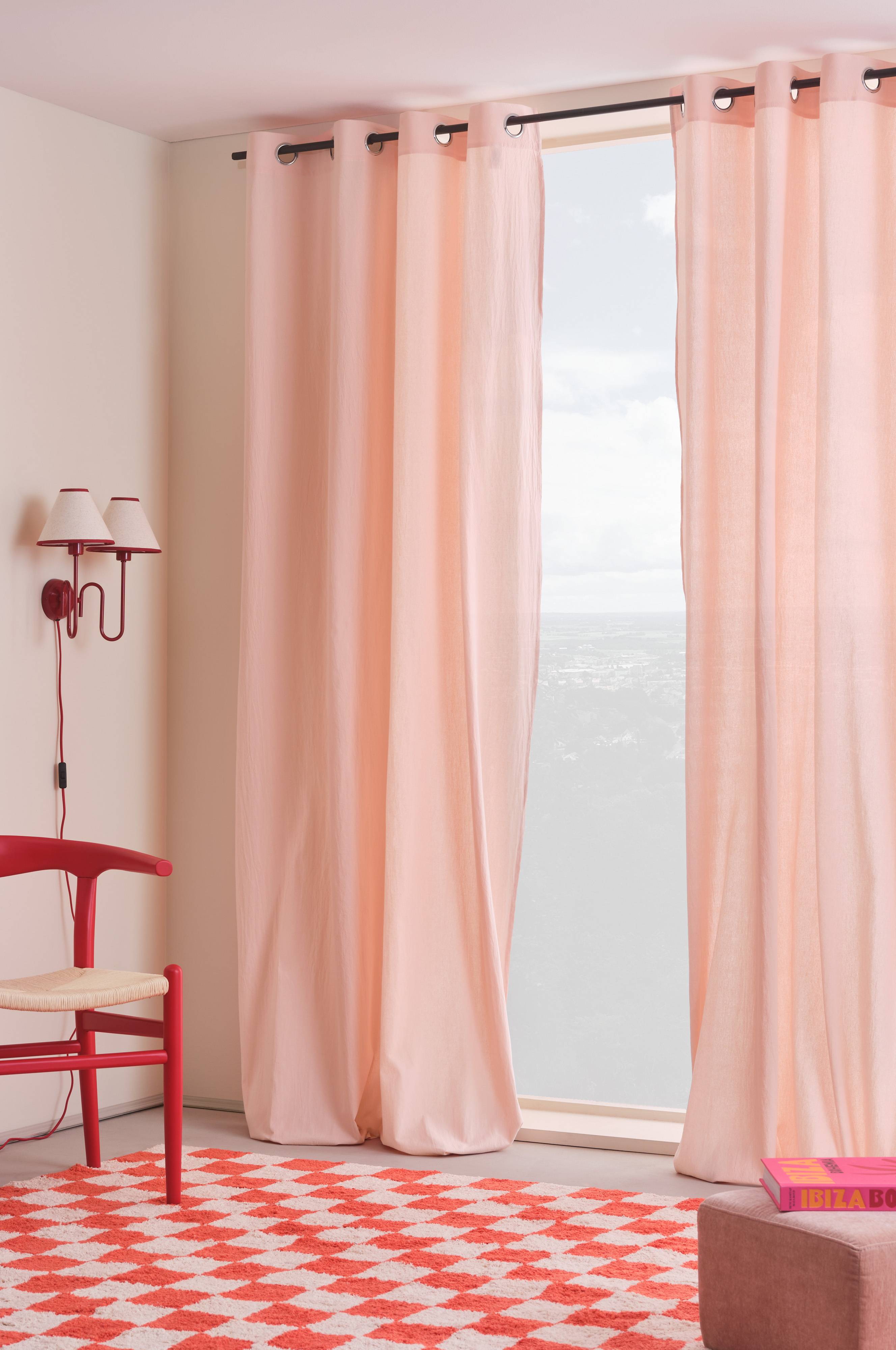 Een set van twee effen gordijnen met ringen van soepel katoen in zachte, gedempte tinten. Acht metalen ringen per gordijn. Eenvoudig aan de gordijnroede te rijgen. Effen gordijnen bieden grote vrijheid bij het matchen en zijn fraai te combineren met andere dessins en kleuren als je dat wilt.