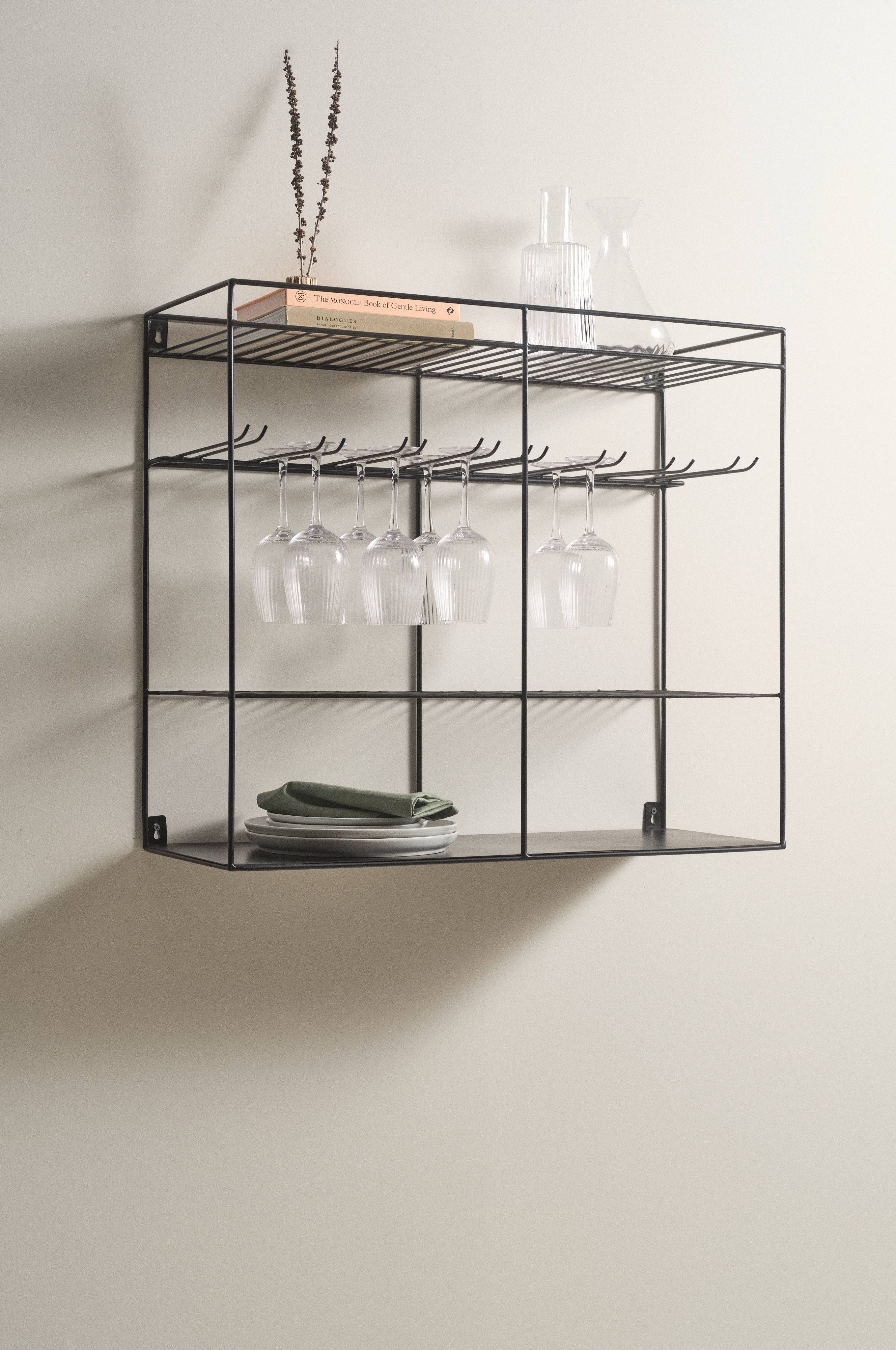 Een handgemaakt wandrek van ijzer dat op een stijlvolle manier extra opbergruimte biedt in de keuken. Het rek heeft drie legplanken en speciale houders om glazen met een voet op te hangen. Vier ophanggaatjes aan de achterkant. Door mooi serviesgoed en glaswerk open op te bergen, creëer je sfeer in de keuken en kun je er ook van genieten als je ze niet gebruikt.