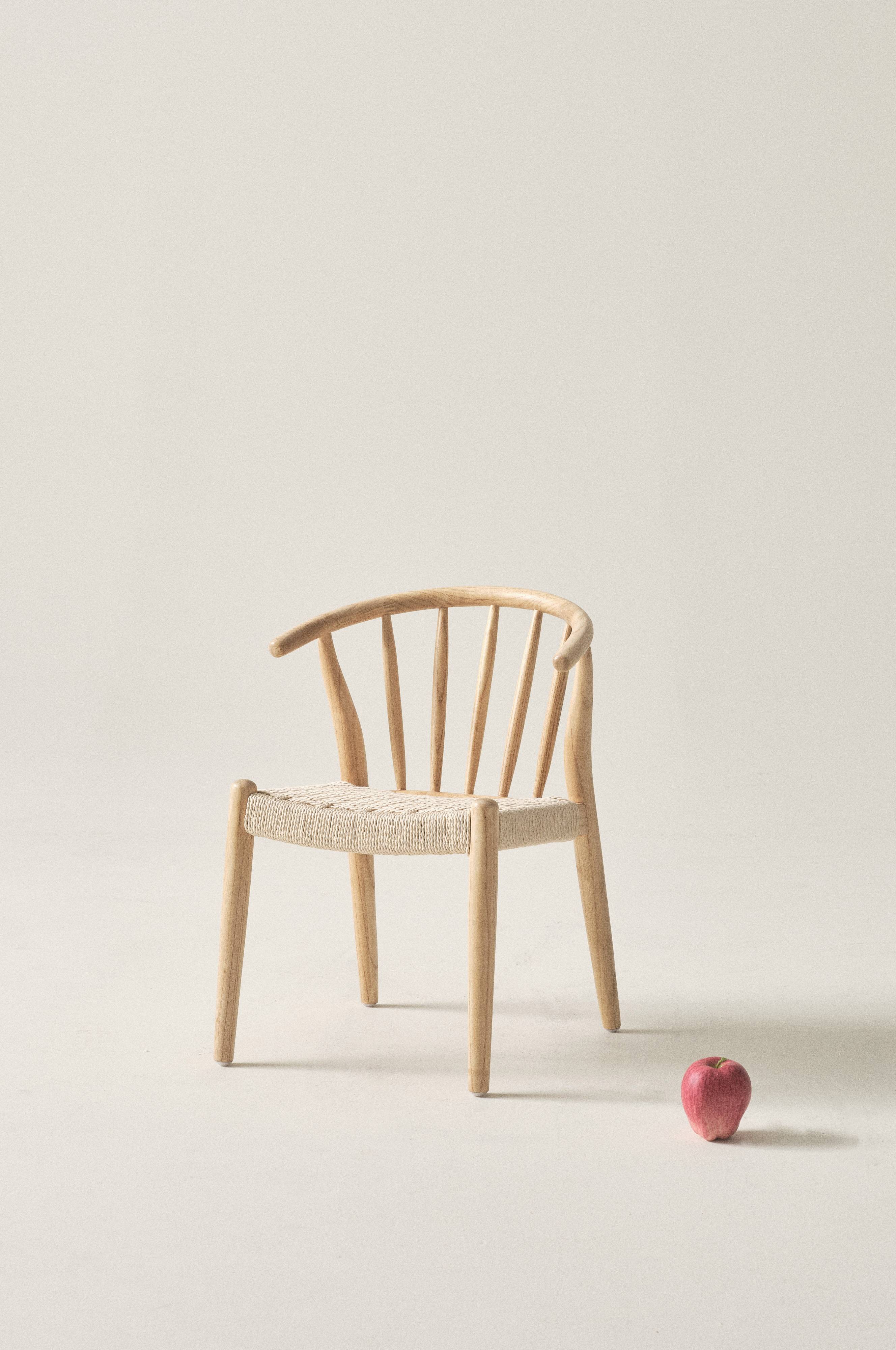 Een stoel van iepenhout met een lak op waterbasis en een zitting van dubbel, gevlochten papieren koord. De stoel is afgewerkt met een verf op waterbasis. SAREK is een kleine stoel in een kindermaat. De stoel heeft een Scandinavische stijl met een simpel, klassiek en stijlvol design.