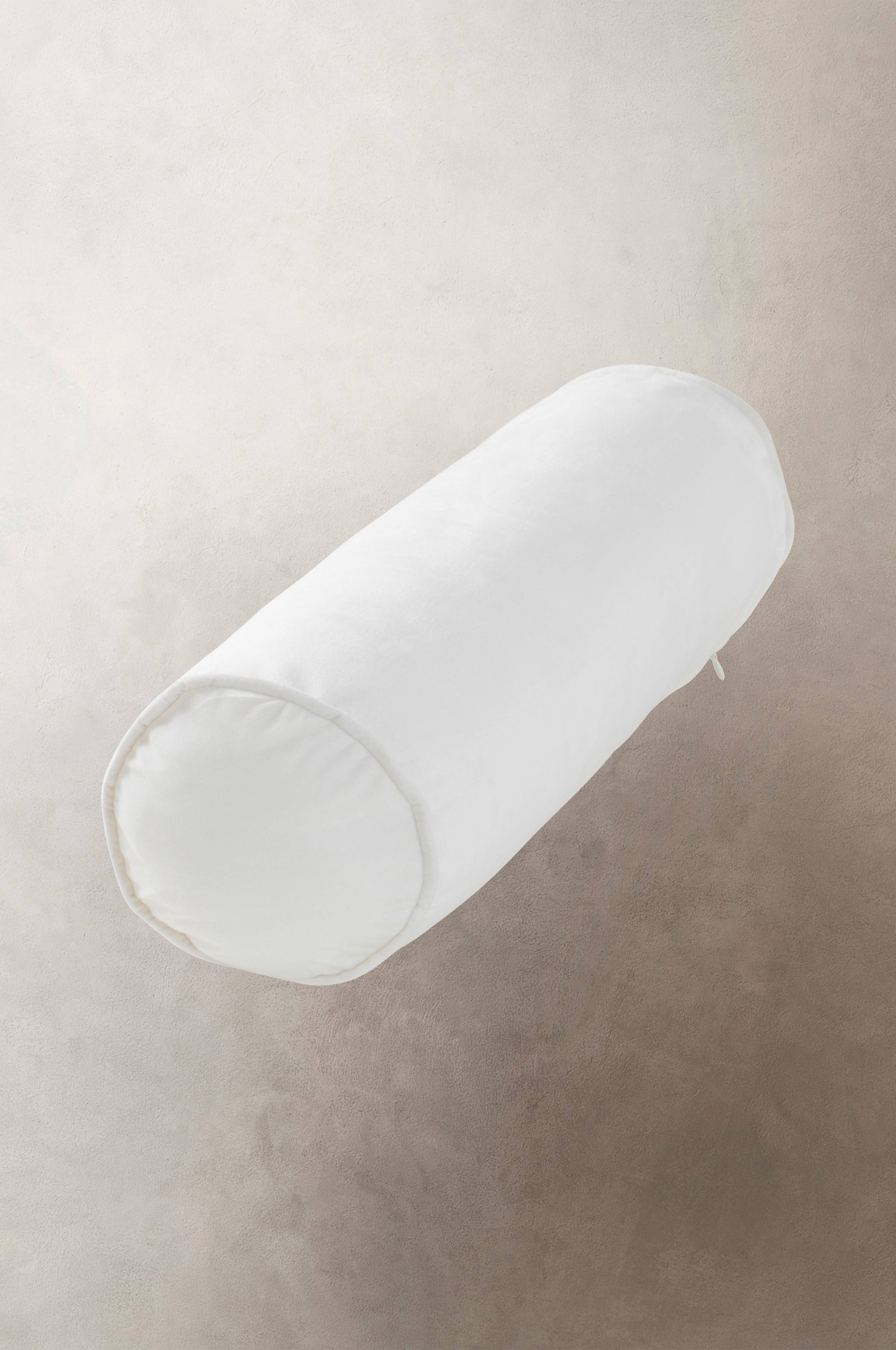Een cilinderkussen van polyester. De buitentijk is van effen fluweel met een prachtige glans dat zacht aanvoelt, de kleur schittert prachtig in verschillende soorten licht. Het kussen is rondom afgebiesd en is voorzien van een blinde rits. Het binnenkussen heeft een tijk en vulling van polyester. Gewicht vulling 350 g.