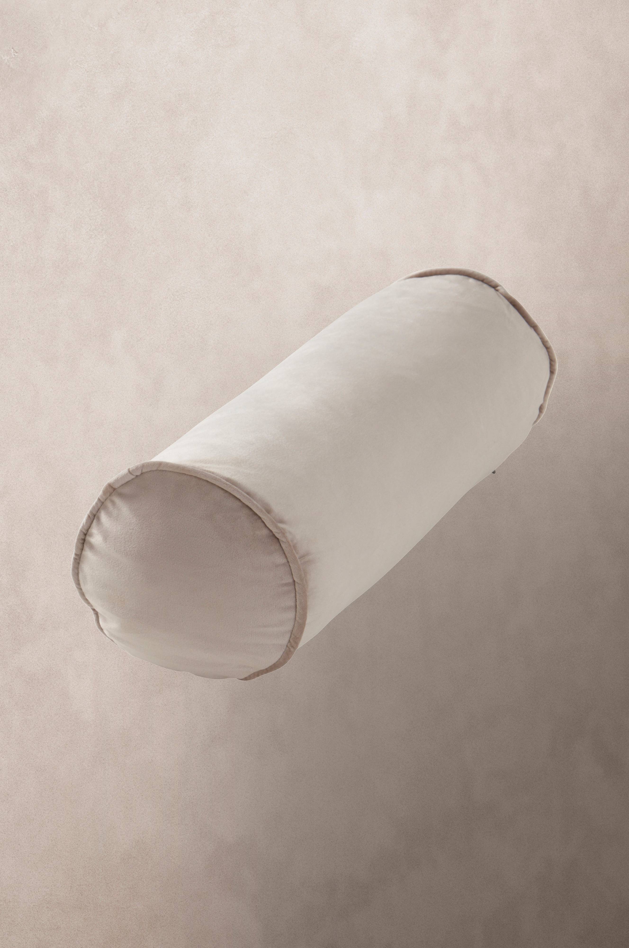 Een cilinderkussen van polyester. De buitentijk is van effen fluweel met een prachtige glans dat zacht aanvoelt, de kleur schittert prachtig in verschillende soorten licht. Het kussen is rondom afgebiesd en is voorzien van een blinde rits. Het binnenkussen heeft een tijk en vulling van polyester. Gewicht vulling 350 g.