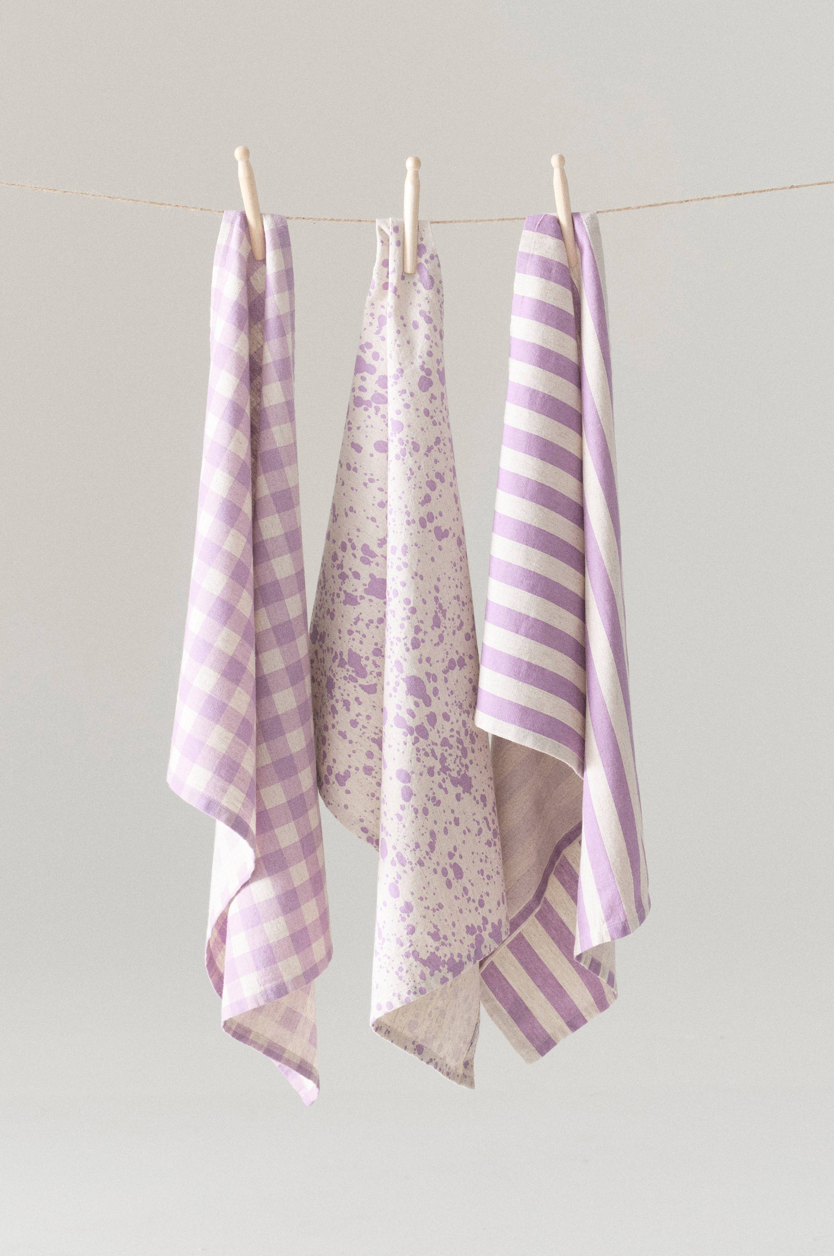 Een set van drie theedoeken van katoenmix waarin linnen is verwerkt wat de stof stevigheid geeft. De theedoeken hebben frisse geprinte dessins: gestreept, geruit en met spetters.