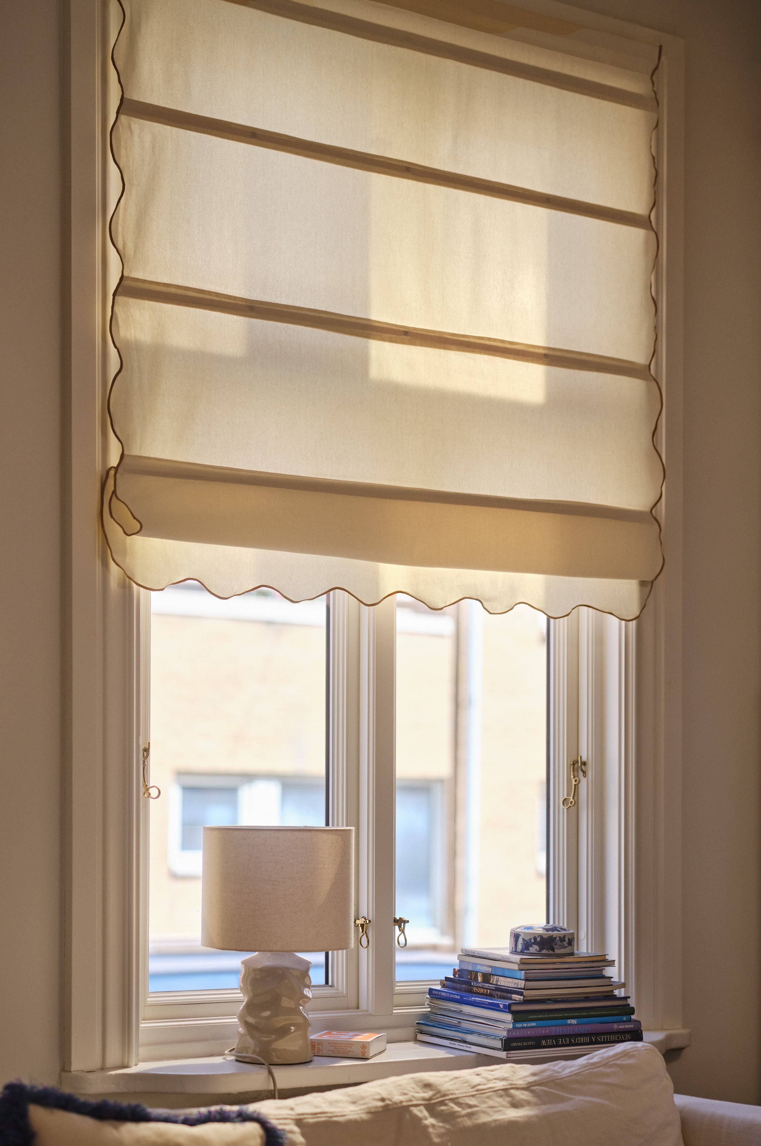 Charmant vouwgordijn, gemaakt van soepel katoen, betovert met prachtige golvende randen. Dit gordijn is perfect voor kinderkamers en brengt plezier en eigenzinnigheid in de ramen. Deze oprolbare gordijnen hebben een slimme hoogteregeling dankzij de bijbehorende magneten aan de zijkanten. Moeiteloos op te hangen aan elke normale gordijnroede.