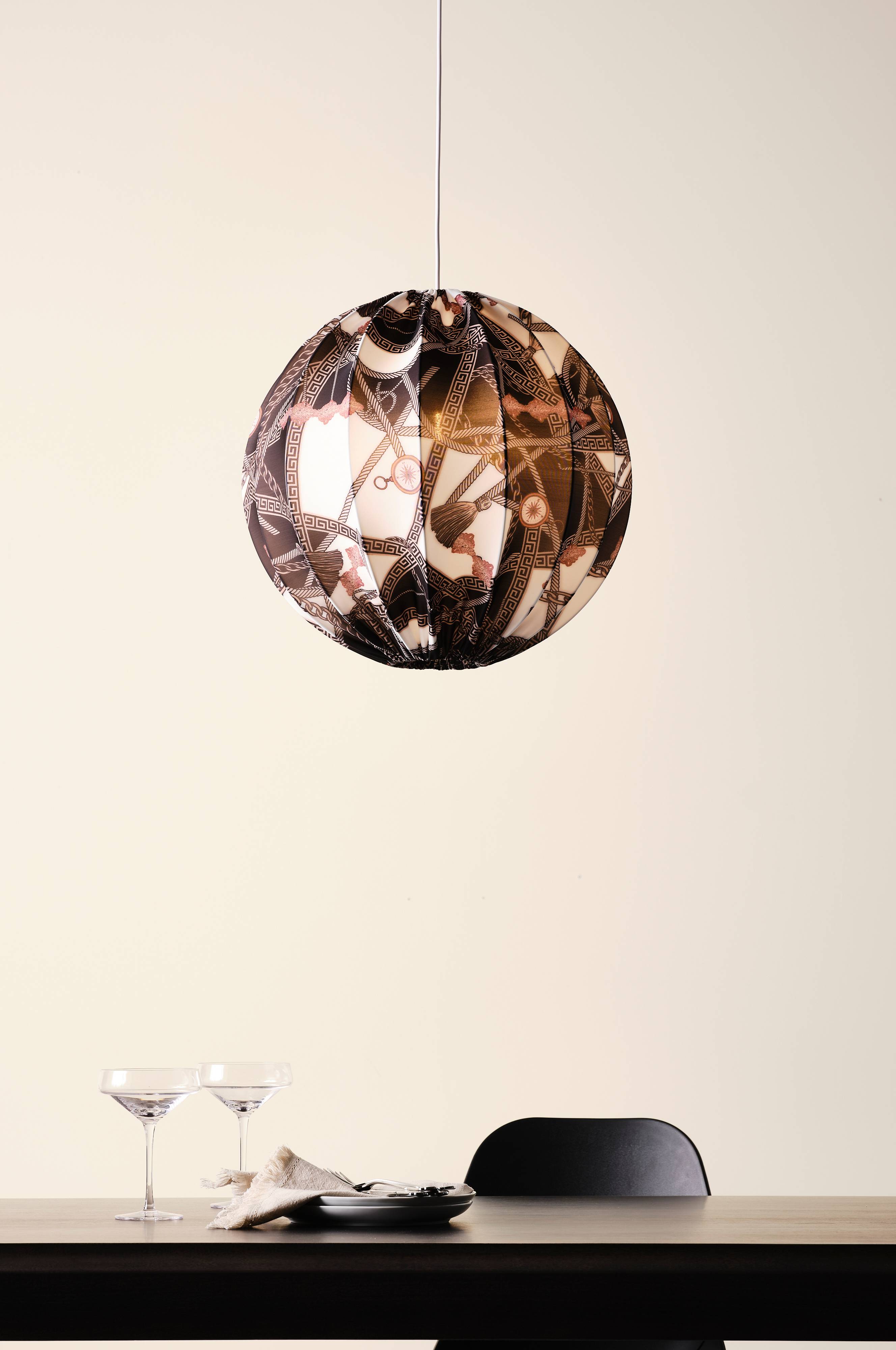 Een hanglamp van gedessineerde stretchstof met een metalen frame. Wit snoer, snoerlengte 1,2 m. Exclusief plafondstekker op grond van EU-regelgeving. Een plafondstekker is los verkrijgbaar en heet ROOF EARTH plafondstekker.