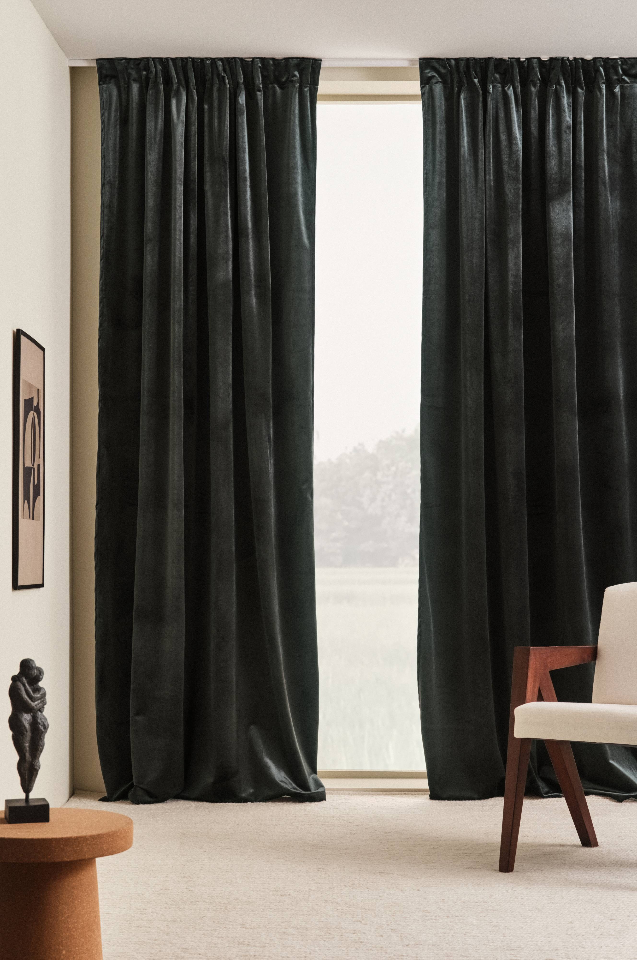 Twee gordijnen van elegant fluweel van polyester. De fluwelen stof glanst prachtig, de kleur verschilt afhankelijk van de lichtinval. Het gordijn heeft een vastgestikt multifunctioneel gordijnband. Het gordijn kan met vingerhaken, roedetunnel of blinde lussen worden opgehangen.