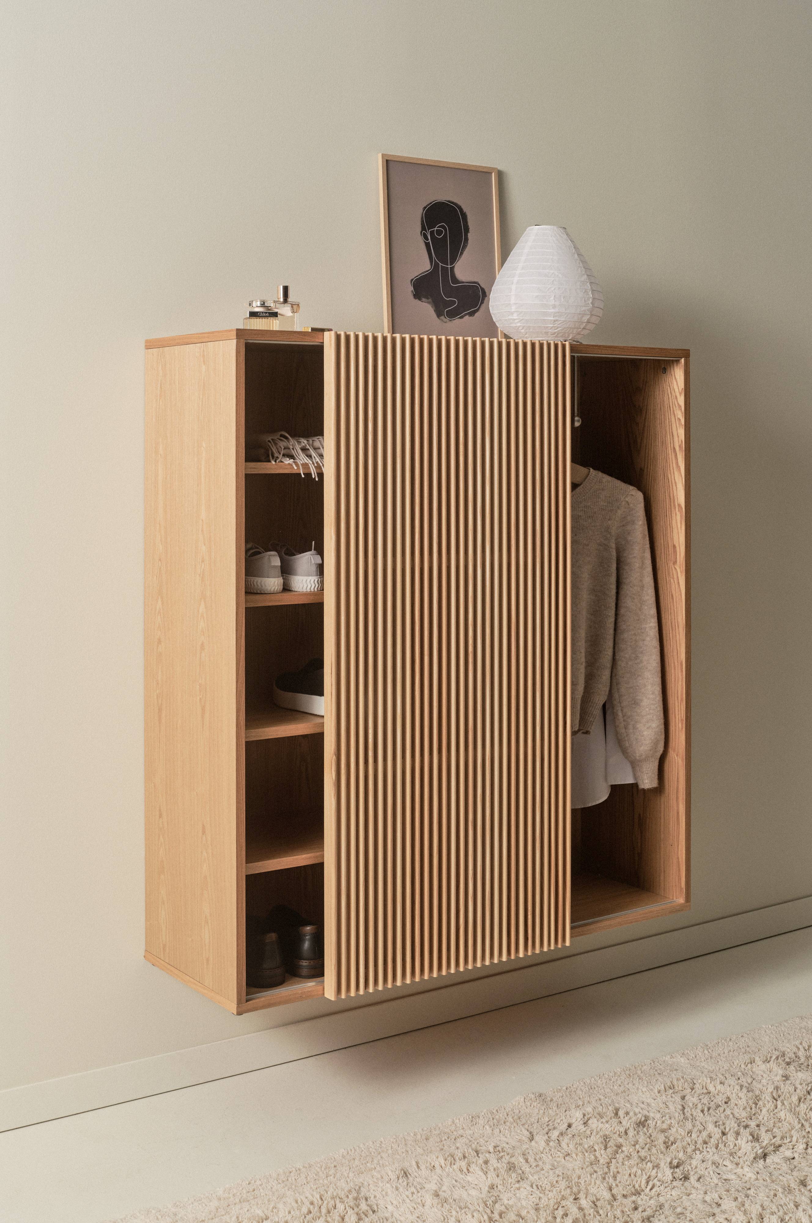 Een halkast met een schuifdeur en poten van massief essen en een frame van mdf met essenfineer. De kast wordt aan de muur gemonteerd. De kast heeft een natuurlijke, Scandinavische uitstraling met een vleugje retro. De stijlvolle deur bestaat uit essenhouten latjes met afgeronde hoeken. De ruimte tussen de latten geven de kast een licht transparante look. De schuifdeur sluit de helft van de kast waarin je kleding kunt ophangen. De andere helft heeft open planken voor bijvoorbeeld schoenen, tassen, mutsen en handschoenen. De kast heeft vier planken waarvan je de hoogte kunt veranderen. Inclusief schroeven. Enige montage is vereist. Montage-instructies worden meegeleverd.