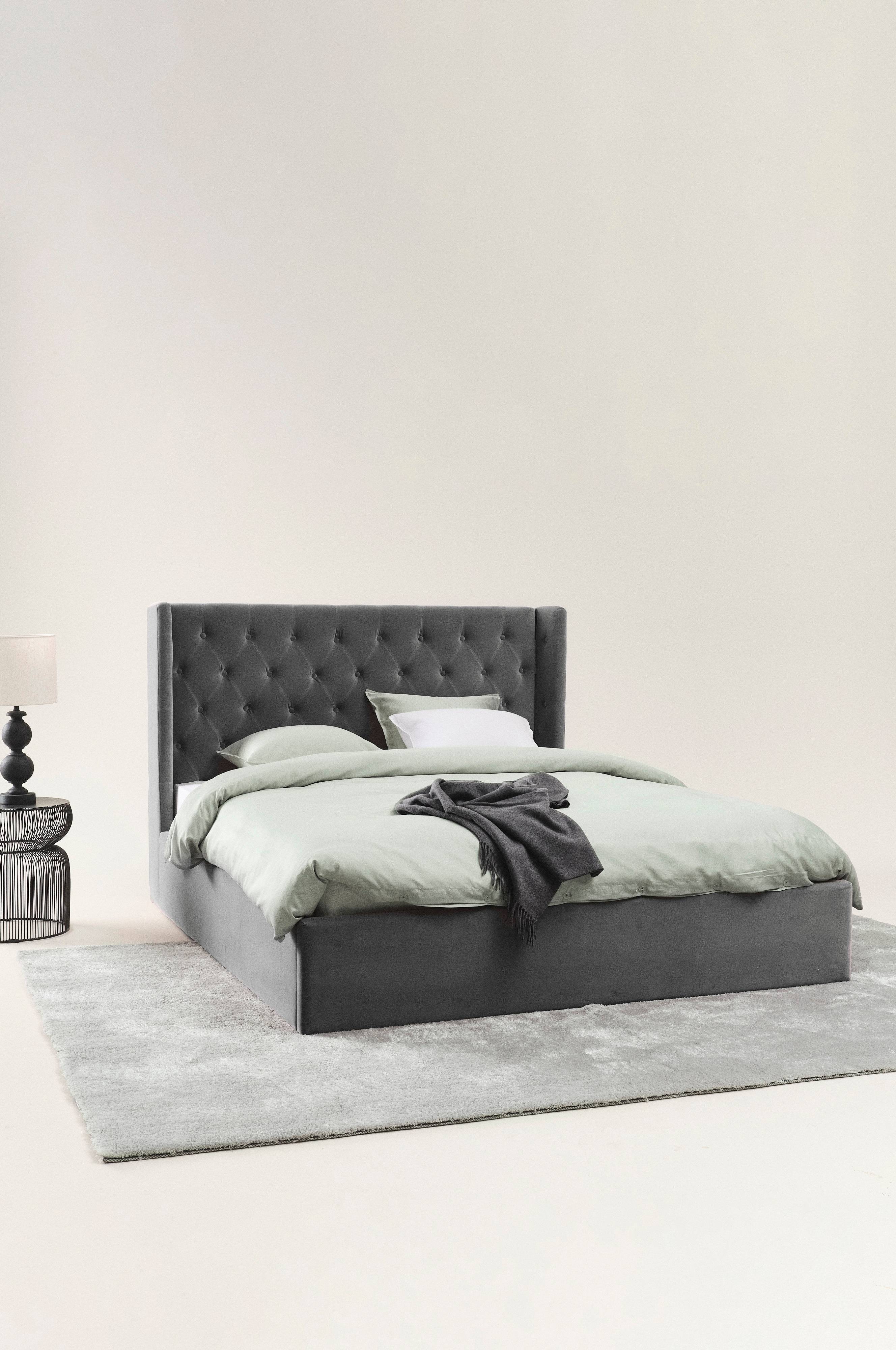 Een bedframe met een mooie fluwelen bekleding en een zachte vulling. Het hoofdbord heeft decoratieve, gecapitonneerde beklede knopen en een uitstaande rand aan beide zijden voor een knus gevoel. De zijkanten en het voeteneind zijn stijlvol glad. Het frame rond het bed komt bijna tot op de grond, er is slechts een klein kiertje zodat de lucht onder het bed kan circuleren. Het bedframe heeft een lattenbodem van grenen. Maak het bed compleet met matrassen of boxsprings, afhankelijk van je voorkeur. Matras/boxspring niet inbegrepen.