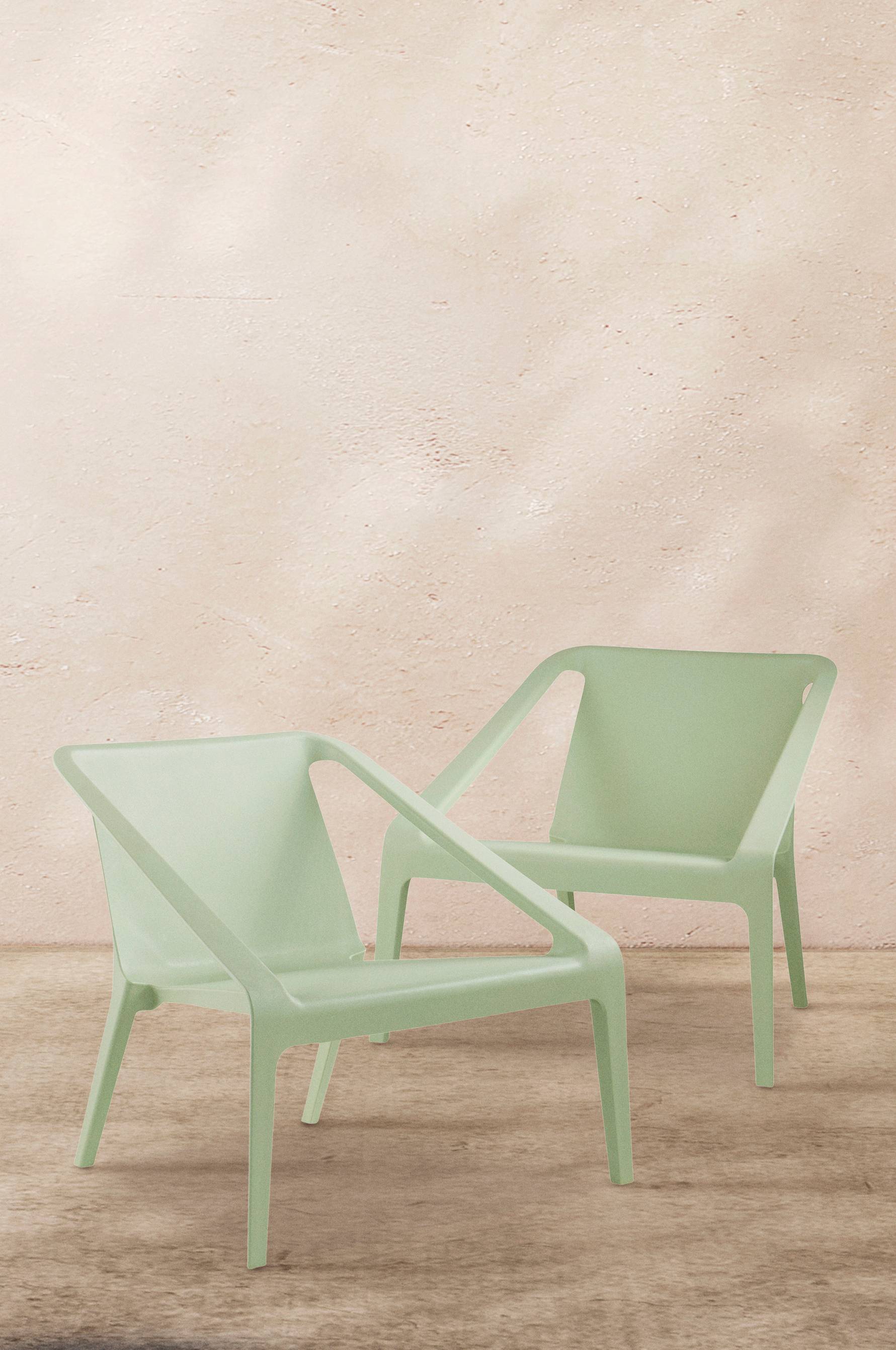 Een set van twee loungestoelen van gegoten kunststof. Een comfortabele loungestoel met een vormgegoten zitting van polypropyleen. De stoelen zijn stapelbaar, waardoor ze eenvoudig opgeborgen kunnen worden.