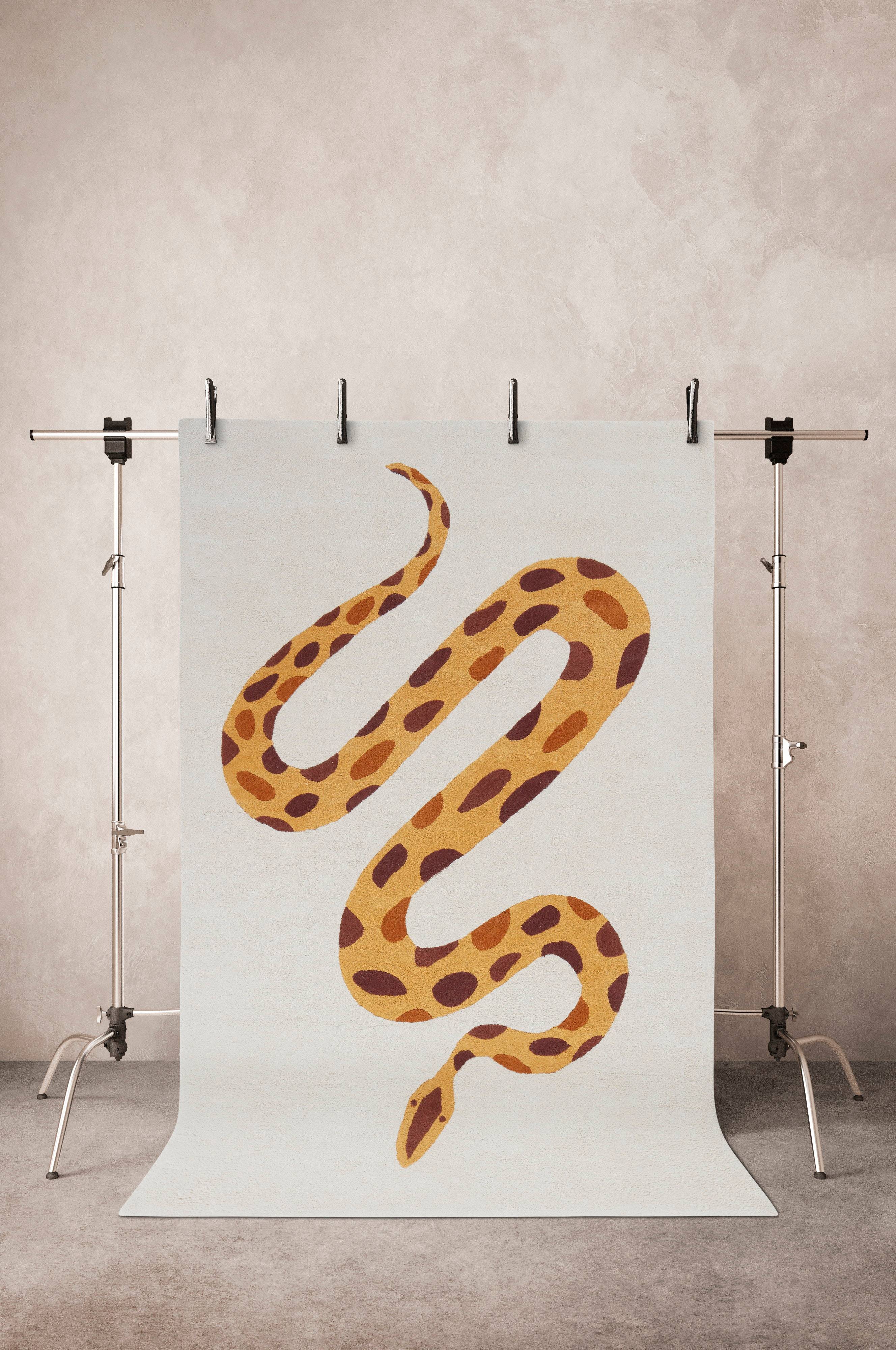 Prachtig, handgetuft vloerkleed van biologisch katoen met een slangmotief in mooie kleuren. Een heerlijk zacht vloerkleed, perfect voor kinderen die op de grond willen spelen. Poolhoogte 0,9-1,1 cm. Dikte 1,4-1,5 cm. 3200-3400 gr./m².