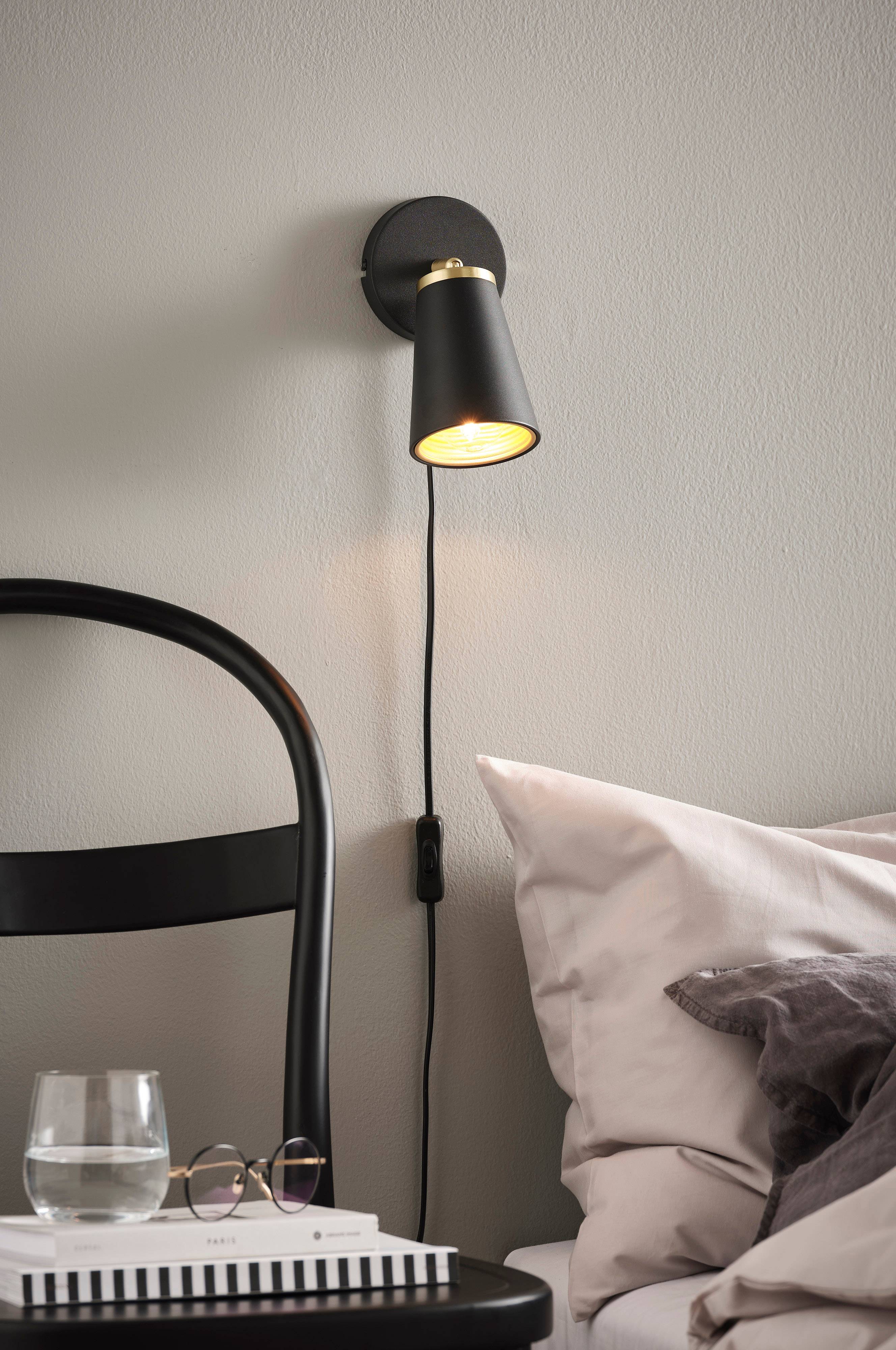 Een wandlamp van metaal. De zwarte lamp heeft een goudkleurige binnenkant en een zwart snoer. Lengte snoer 110 cm. De witte lamp heeft een verchroomde binnenkant en een wit snoer. Lengte snoer 110 cm.